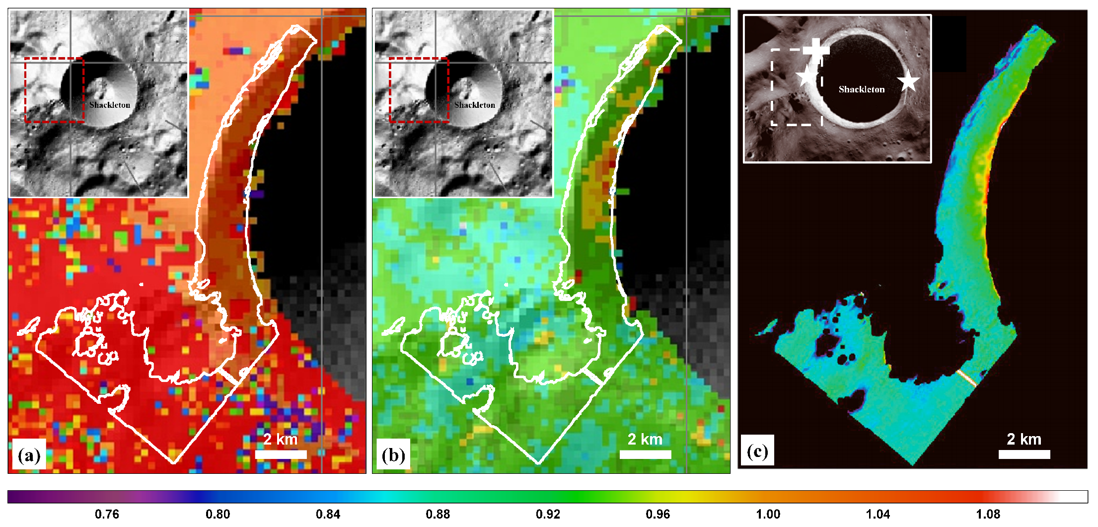 Figure 16c). The highest ratio values are consistently observed on the western inner wall of Shackleton Crater in both datasets, corresponding to known locations of pure anorthosite (PAN) previously identified through LROC NAC observations [