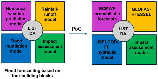 The overall concept of the proposed DT framework is built around four core components—a meteorological forecast model, a rainfall–runoff model, a flood inundation model, and an impact assessment model—that collectively support advanced flood forecasting and flood risk reduction, improved by DA approaches. Figure 1 provides a schematic overview of this concept and its adaptation for the proof-of-concept implementation presented in this study. This present work aims at generating flood depth maps at extended lead time by relying on various data inputs, such as the Global Flood Awareness System (GloFAS) medium-range flood streamflow forecasts (https://global-flood.emergency.copernicus.eu/technical-information/glofas-30day/ (accessed on 1 October 2025)) [70,71] and Global Flood Monitoring (GFM) (https://global-flood.emergency.copernicus.eu/technical-information/glofas-gfm/ (accessed on 1 October 2025)) flood extent observations [72,73]. Both are products of the Copernicus Emergency Management Service (CEMS). The GloFAS medium-range flood streamflow forecasts (called henceforth GloFAS forecasts for the sake of simplicity) are ensemble real-time daily discharge forecasts issued for the next 30 days. The ensemble includes one control forecast and 50 member forecasts. On the other hand, GFM provides a continuous global monitoring service of flood events by processing and analyzing all incoming Sentinel-1 SAR imagery in near real-time (NRT), including the HASARD© mapping algorithms developed by the Luxembourg Institute of Science and Technology (LIST) [35,67,74].