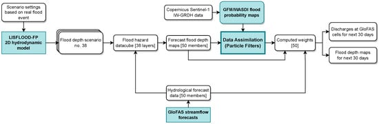 Figure 2 illustrates the diagram of the proposed flood forecasting system. In this research work, the flood forecasting strategy involves the local grid-based hydraulic model LISFLOOD-FP combined with inflow discharges provided by GloFAS streamflow forecasts. However, the daily GloFAS forecast discharge ensemble is not directly used as forcing data for the LISFLOOD-FP model. Instead, the hydrodynamic LISFLOOD-FP model is employed to compute a series of flood depth maps beforehand based on various scenario settings that account for a wide range of meteorological and hydrological conditions. The GloFAS forecast discharges are then used as a reference to identify and select the corresponding pre-computed flood depth maps, rather than serving as direct forcing data for conventional hydraulic simulations. Lastly, the DA process is implemented using a PF approach, similar to [17,68], to assimilate flood probability maps that are derived from Sentinel-1 images using GFM [72,73].