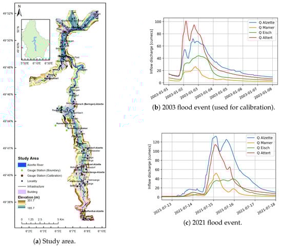 (a) The study area on the Alzette River (Luxembourg). The study reach is located downstream of Luxembourg City between the gauge stations at Pfaffenthal and Ettelbruck. Green solid dots represent gauge stations providing upstream BCs, whereas red solid dots represent those used for the calibration and validation. Inflow discharge for (b) 2003 and (c) 2021 flood events at Pfaffenthal (Alzette River, blue), Schoenfels (Mamer River, orange), Hunnebour (Eisch River, green), and Bissen (Attert River, red).
