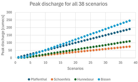 Peak discharge for all 38 scenarios for all four BCs.