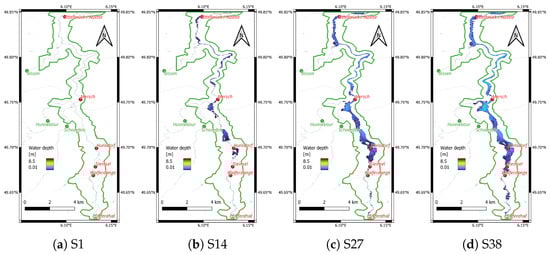 As aforementioned, in order to carry out the proposed method, a flood hazard datacube is necessary. A total of 38 scenarios were generated with the calibrated LISFLOOD-FP model based on the 2021 flood hydrograph scaled to different maximum discharge values at the four BCs. Each scenario reflects a different flow condition, allowing for a comprehensive analysis of hydrodynamic behavior across a wide range of potential discharge rates. The scenarios provide a detailed spectrum of flow responses for various hydraulic conditions, enabling accurate assessments of system performance under both low- and high-flow events. For instance, peak discharge values at Pfaffenthal, represented by , range from 5 to 190 · with an increment of 5 ·. The four BCs (Table 2) were matched based on their associated return periods (summarized by Table A1 in Appendix A). Each of the 38 scenarios corresponds to one return period and one unique set of values across the four BCs, as shown in Figure 4. The appropriate scenario is selected based on the forecasted at Pfaffenthal from GloFAS. Using these scaled hydrographs as input, the LISFLOOD-FP model produces pre-computed water depth maps (Figure 5), which together form the flood hazard datacube. Figure 5 illustrates four sample scenarios, ranging from the lowest to the highest return period scenarios.