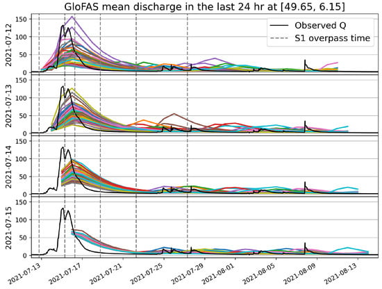 GloFAS streamflow forecasts issued on 12 July (first panel), 13 July (second panel), 14 July (third panel), and 15 July (fourth panel). Observed discharge (black lines) and 50 forecasted daily discharges (colored lines). The overpass times of Sentinel-1 SAR are indicated with vertical dashed lines.