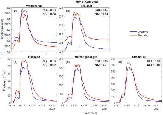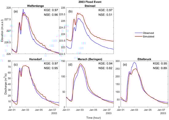 Observed (blue line) and simulated (red line) water levels during 2003 flood event at (a) Walferdange and (b) Steinsel stations, and discharges at (c) Hunsdorf, (d) Mersch, and (e) Ettelbruck stations.