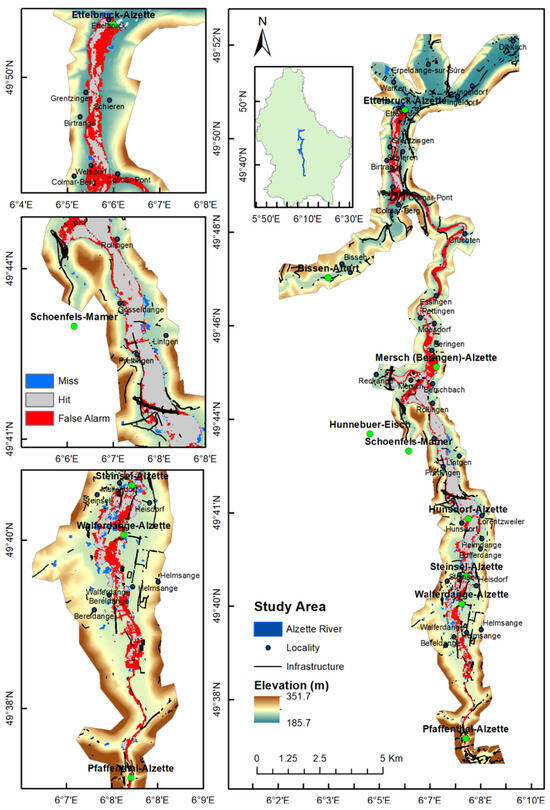 Gauging stations on the Alzette for calibration/validation. Source: https://www.inondations.lu/ (accessed on 15 October 2025).