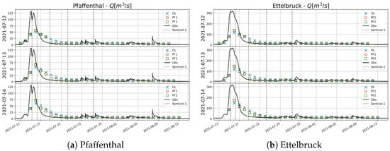 Hourly discharge data from four gauging stations on Alzette at Pfaffenthal, Mamer at Schoenfels, Eisch at Hunnebuer, and Attert at Bissen (Figure 3b,c for the 2003 and 2021 flood event, respectively) were used as the upstream BCs. On the other hand, instead of utilizing the gauging station at Ettelbruck as a downstream stage-varying BC, a free downstream BC was imposed to account for the backwater effect. It should be noted that the 2003 flood event (Figure 3b) is only used for the calibration of the LISFLOOD-FP model, based on in situ data and reference flood hazard maps. On the other hand, the 2021 flood event (Figure 3c) is the focus of the paper, demonstrating the merits of the assimilation of satellite EO data in the context of flood forecasting.