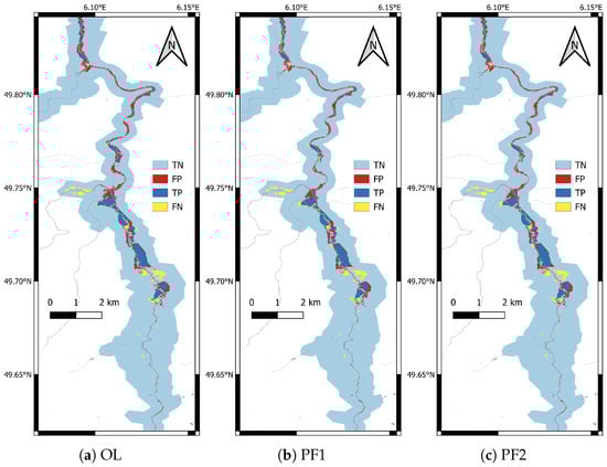 A second flood extent mapping method [75] was also integrated into this study to improve the detection of floodwater in urban areas compared to GFM. This approach exploits Interferometric SAR coherence to identify inundation within built environments and is accessible via the WASDI platform (https://www.wasdi.net/#/edrift_auto_urban_flood/appDetails (accessed on 15 October 2025)). In this work, the PF2 experiment incorporates combined flood probability maps derived from both GFM and the WASDI-based urban flood detections, hereafter referred to as GFM + WASDI in the subsequent sections.