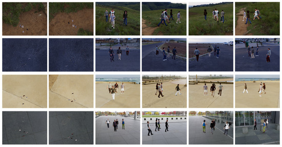 The resulting dataset provides diverse and fully annotated aerial–ground observations, enabling the development and assessment of methods capable of localizing and associating multiple individuals across heterogeneous viewpoints, even in the presence of significant occlusion and appearance variation. It also serves as a benchmark for evaluating multi-view detection and labeling algorithms under conditions representative of practical aerial-vision applications. The examples for the AGMV dataset are provided in Figure 2.