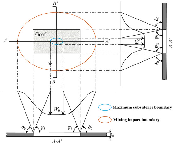 In Figure 1, m is the coal thickness; W0 is the maximum subsidence value of the surface subsidence basin; A-A’ is the strike main section; B-B’ is the dip main section; δ0 is the boundary angle; ψ3 is the sufficient mining angle.