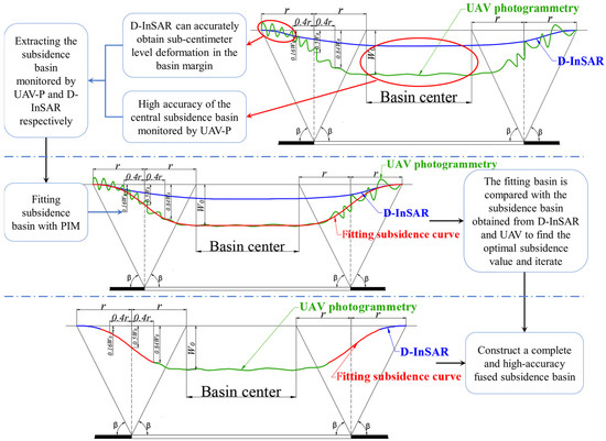Since D-InSAR is prone to time–space decorrelation when monitoring deformation gradients beyond its capacity, using it to monitor the large-scale deformation in the center of the subsidence basin yields inaccurate results. However, D-InSAR can accurately model centimeter-level deformation on the edge of the subsidence basin in the mining area. UAV photogrammetry can effectively extract data on the large-scale deformation in the central subsidence basin with relatively high accuracy, which can make up for the deficiency of D-InSAR. In order to model the actual terrain of the subsidence basin in the mining area, the respective advantages of D-InSAR and UAV photogrammetry technology should be fully utilized and combined with the characteristics of surface subsidence. The inflection point of the subsidence basin is taken as the origin, and the distance ±r from the inflection point is the boundary. The small deformation of the basin edge monitored by D-InSAR is extracted at a position less than −r, and the large-scale deformation of the basin center monitored by UAV photogrammetry is extracted at a location greater than +r. Taking the high-precision basin edge and center subsidence data as the constraints, the probability integral method is then used to fit the subsidence basin, calculate the difference between the fit value and the measured value, and find the optimal subsidence value according to the degree of deviation of the difference. Then, the optimized subsidence data are taken as the constraint condition, iterations are carried out until the error between the fitting basin and the optimized basin (i.e., the fusion basin) is minimized, and eventually a complete and accurate model of the subsidence basin is obtained. Figure 3 shows an outline of the method.