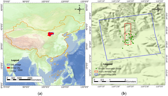 (a) Location of the experimental area: Ordos City, China. (b) Topographic map of 2S201 working face of Wangjiata coal mine. The positions of ground observation points, and mining progress of the working face are marked.