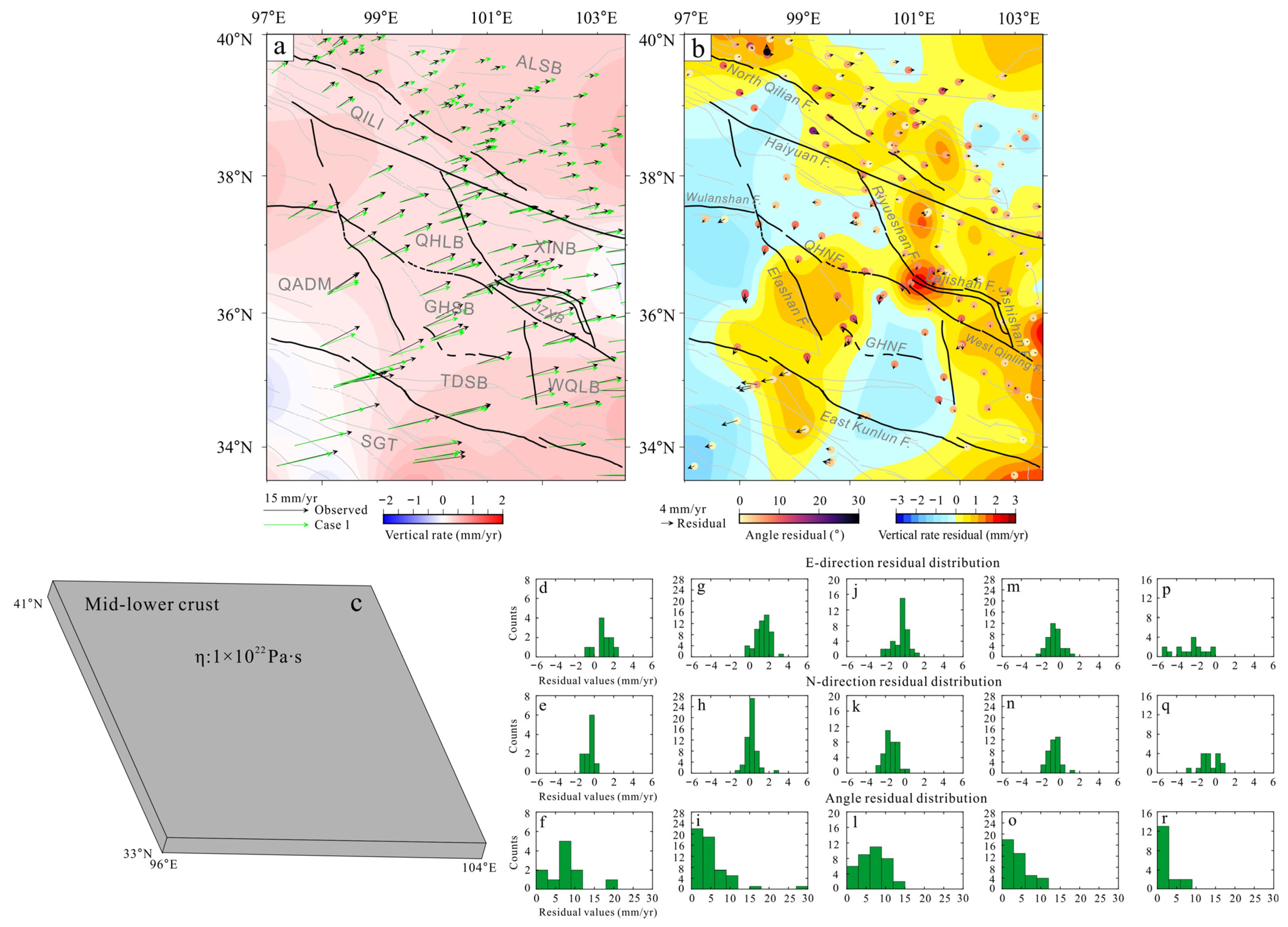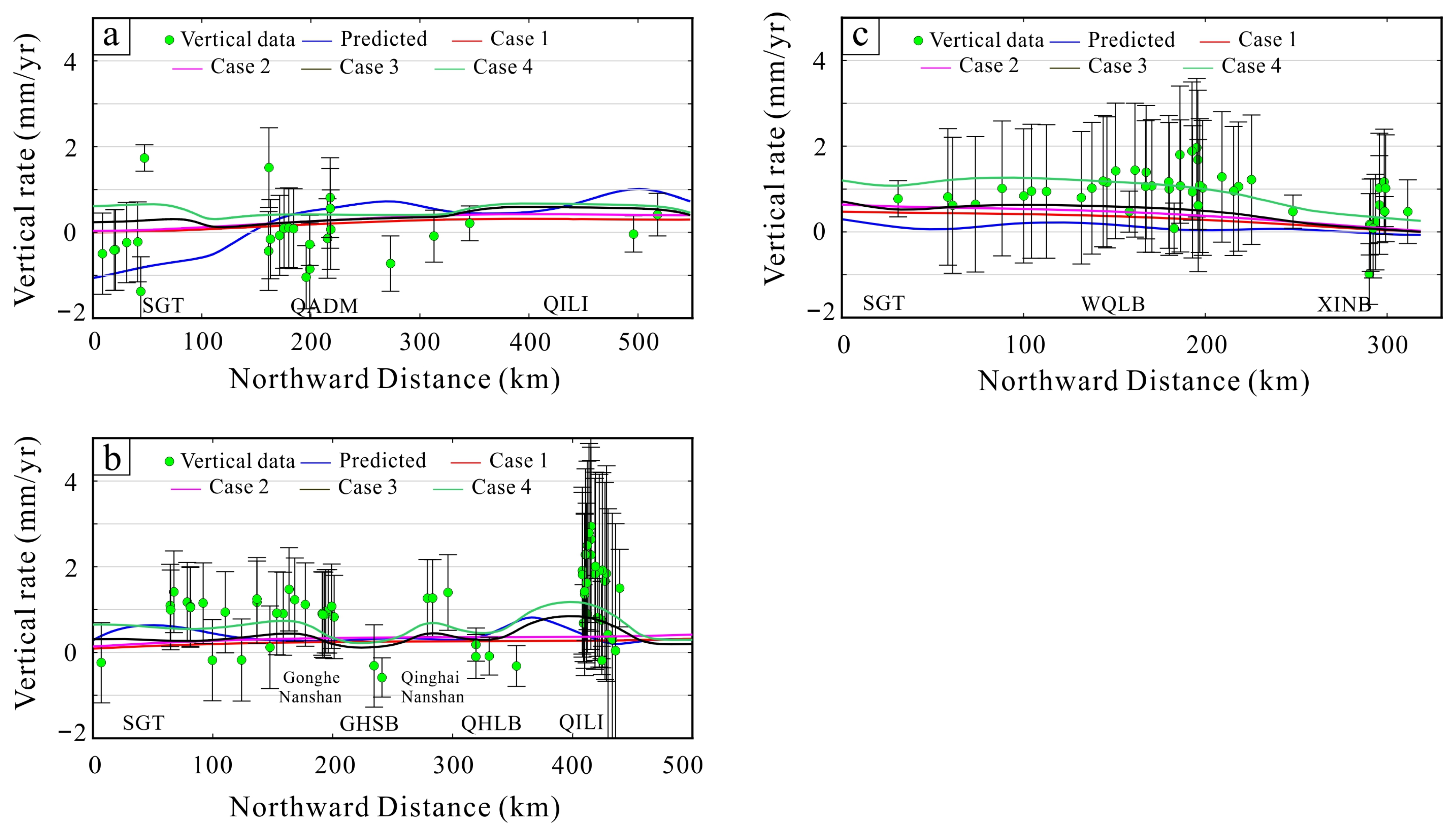 - Vertical deformation driven solely by the horizontal velocity field can explain the first-order features of differential uplift, characterized by higher uplift rates in the Qilian Orogen and the Songpan–Ganzi Terrane and lower uplift rates in the intervening domains. In the Qilian Orogen, the vertical velocities are broadly consistent with geodetic observations, indicating that crustal shortening and thickening dominate its deformation. However, compared with the present high-precision vertical velocity field, vertical velocity residuals > 1 mm/yr still exist in more localized areas, implying that crustal deformation cannot be fully explained by crustal shortening under the influence of the horizontal GPS velocity field.