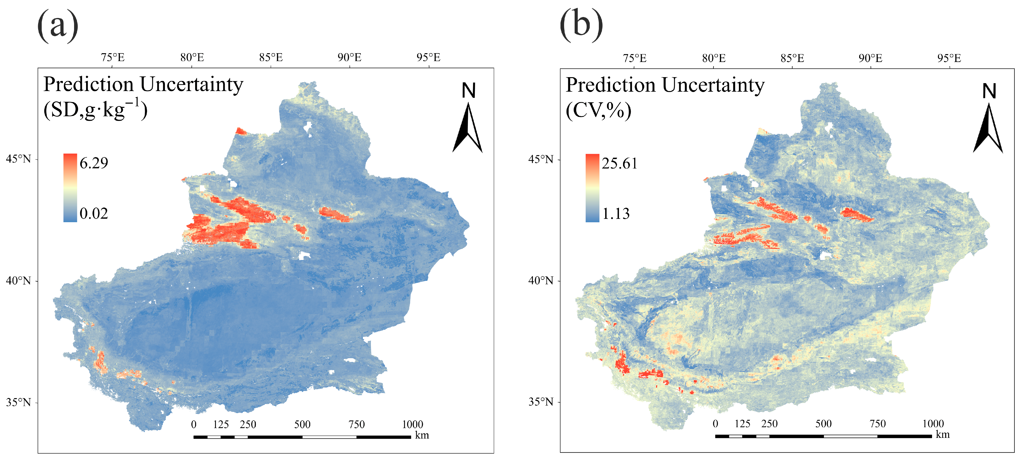 3.2.4. SOC Spatial Distribution Patterns and Uncertainty
