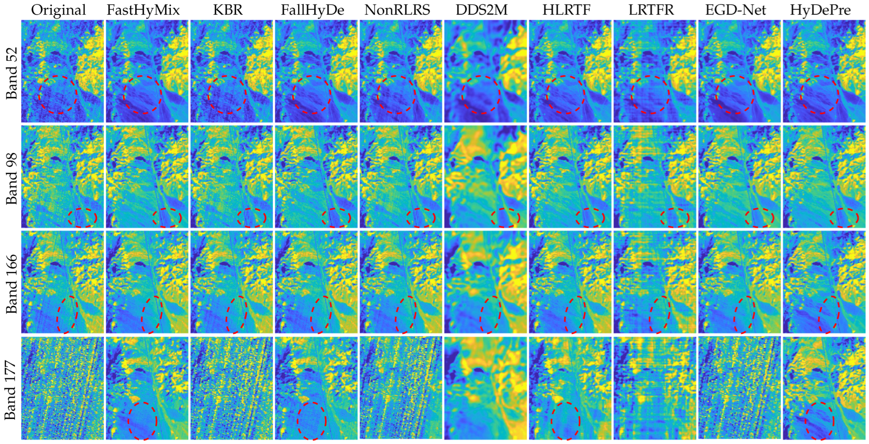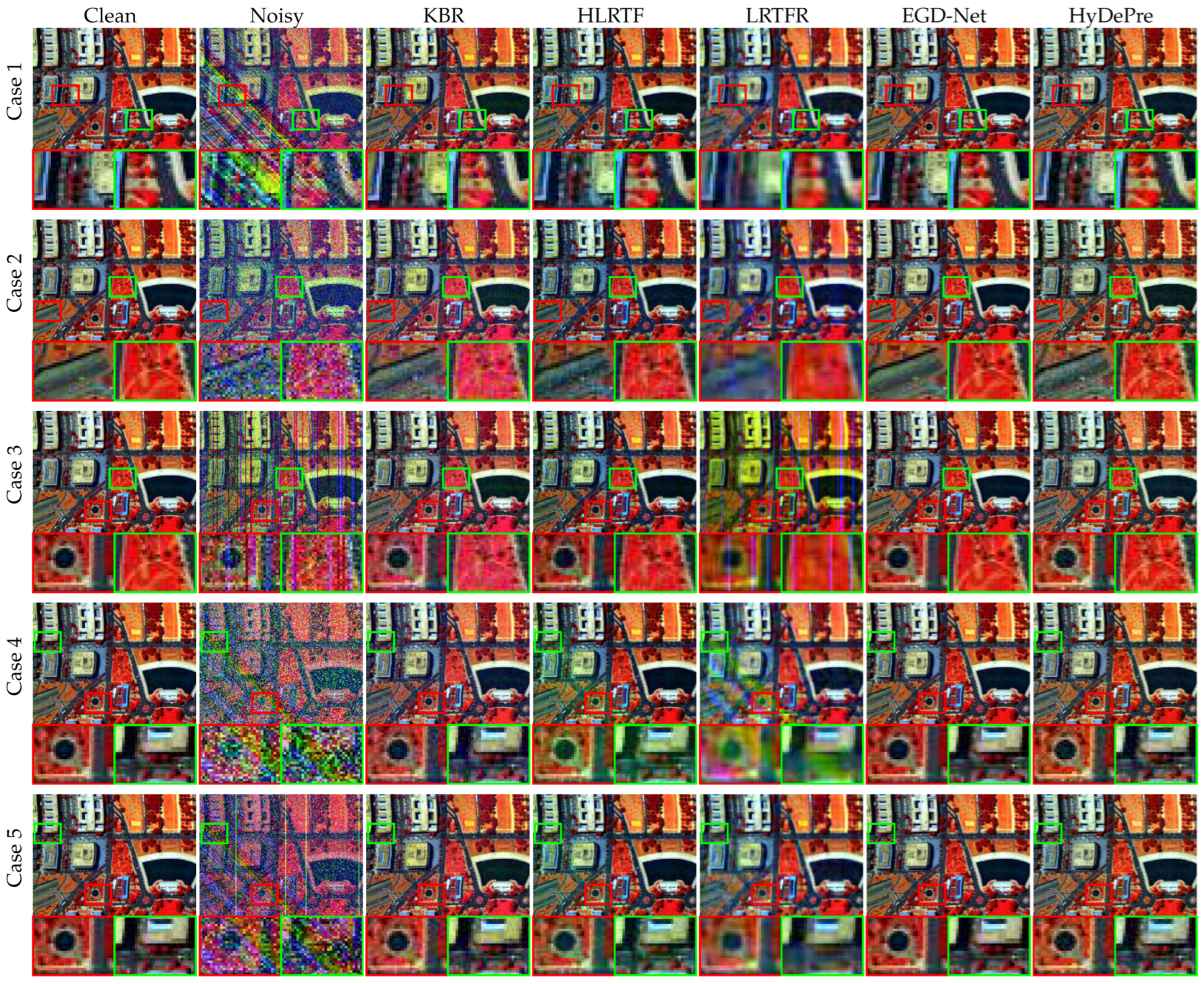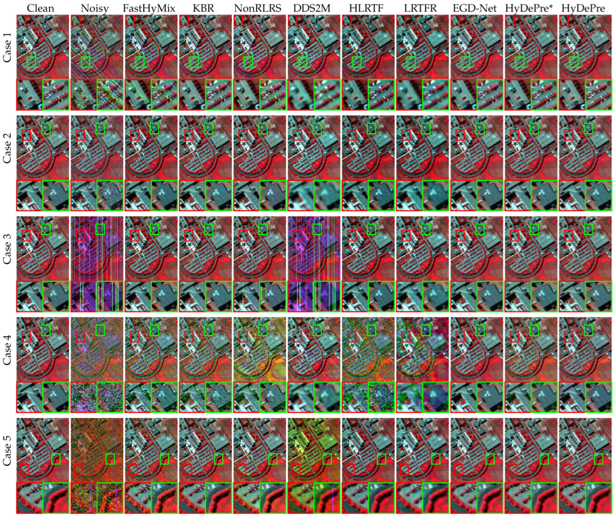 | Case | Metric | Noisy | FastHyMix (TNNLS, 2021) [53] | KBR (TPAMI, 2017) [19] | FallHyDe (TGRS, 2024) [56] | NonRLRS (TIP, 2019) [18] | DDS2M (ICCV, 2023) [38] | HLRTF (CVPR, 2022) [37] | LRTFR (TPAMI, 2024) [39] | EGD-Net (JSTARS, 2025) [59] | HyDePre* (Proposed) | HyDePre (Proposed) |