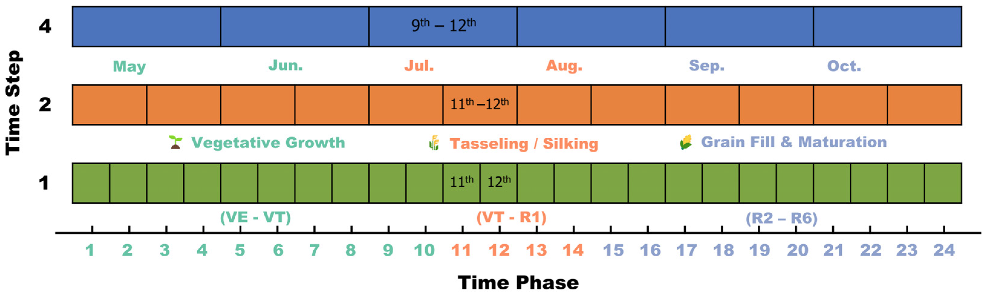 - The period from July to August constitutes a critical window for early yield prediction of summer crops, encompassing the phenological stages from tasseling to mid-grain filling. This window enables an optimal balance between forecast timeliness and accuracy through the integration of multi-source data, facilitating the generation of reliable predictions to inform pre-harvest decision-making.