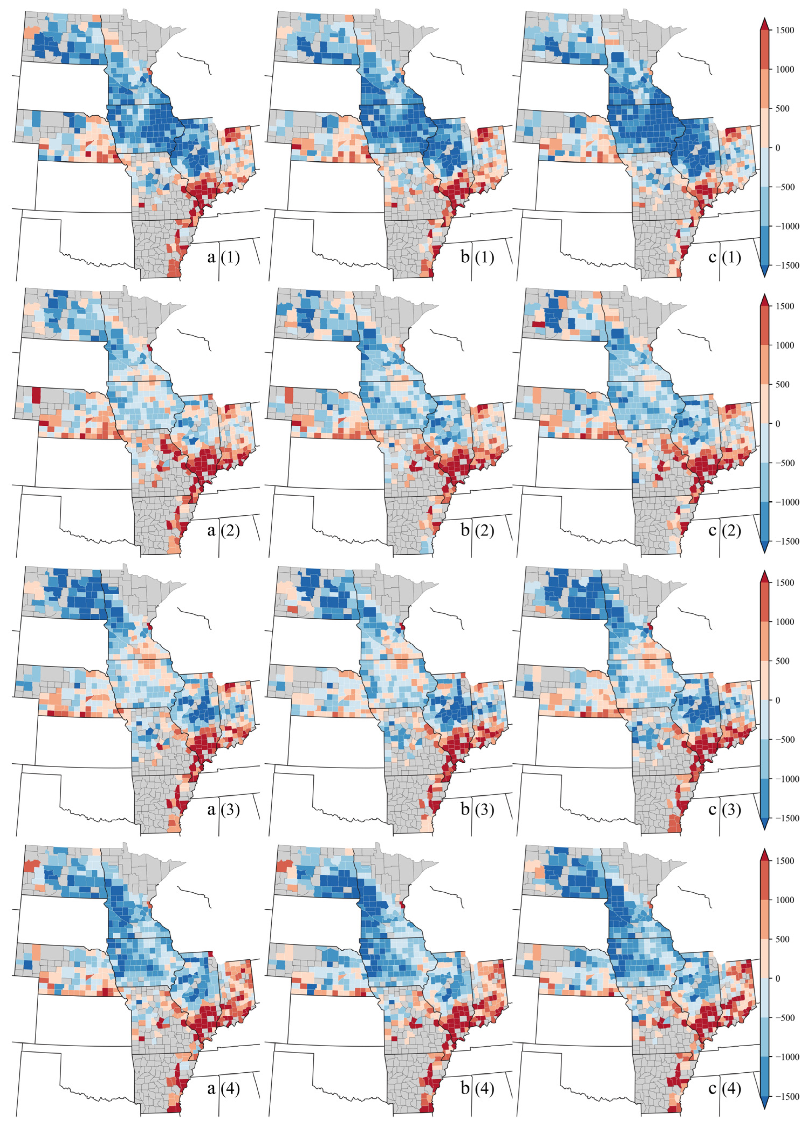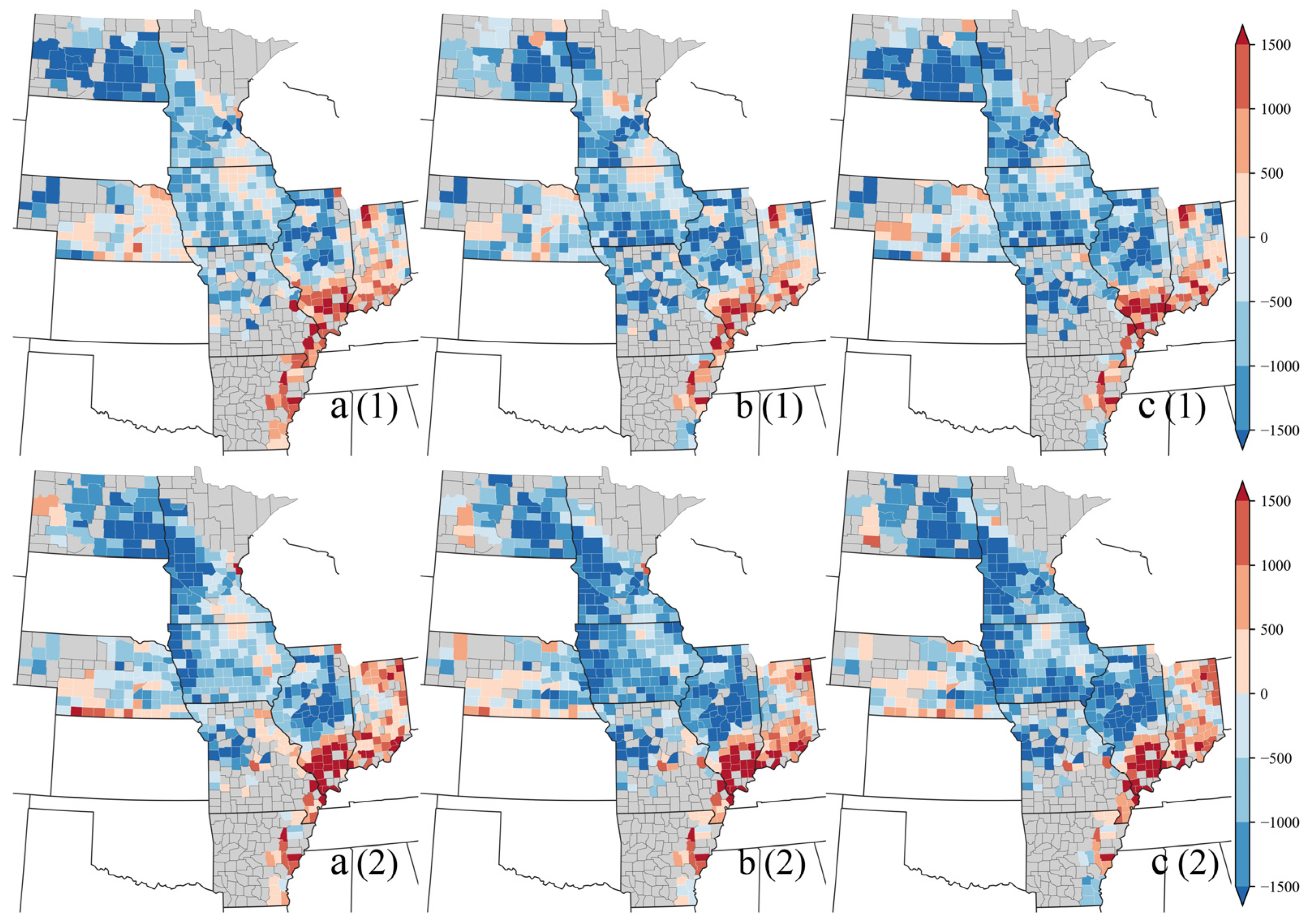 - Sabut, A.; Tripathy, K.P.; Mishra, A.; Anderson, M.; Cosh, M.; Kraatz, S.; Gao, F.; Cirone, R. Assessing the Impact of Climate Indices on Corn Yield in the Continental USA Using Machine Learning Approach. Agric. For. Meteorol. 2025, 371, 110632. [Google Scholar] [CrossRef]