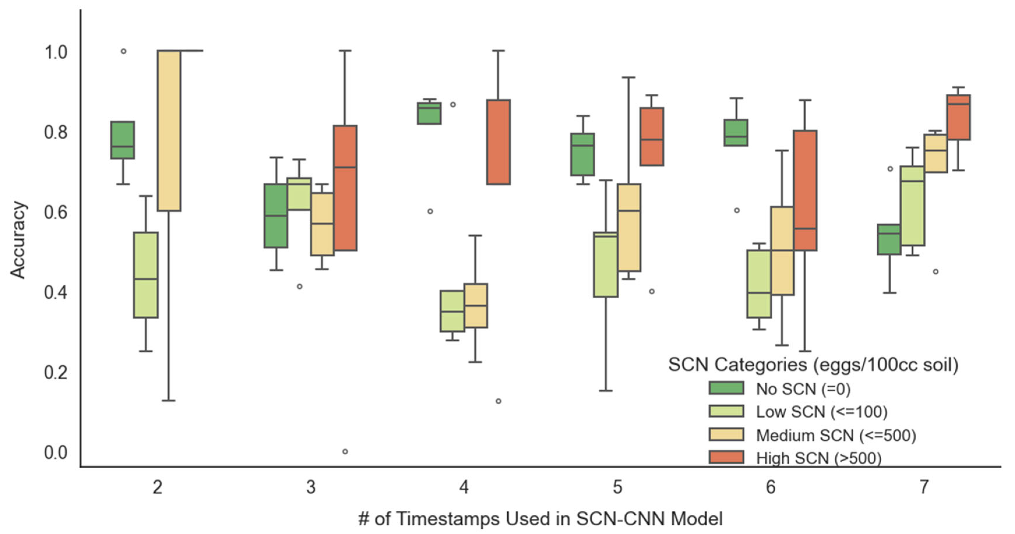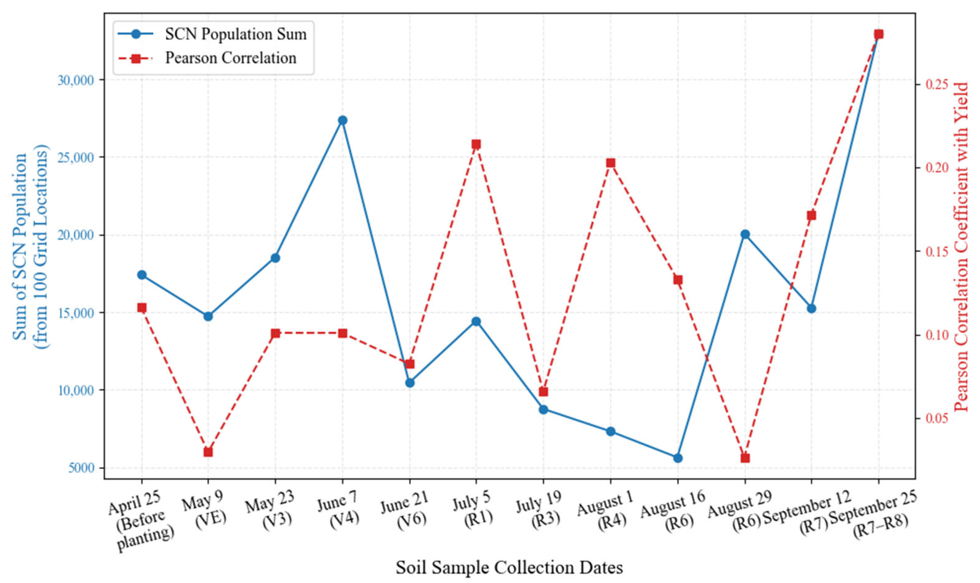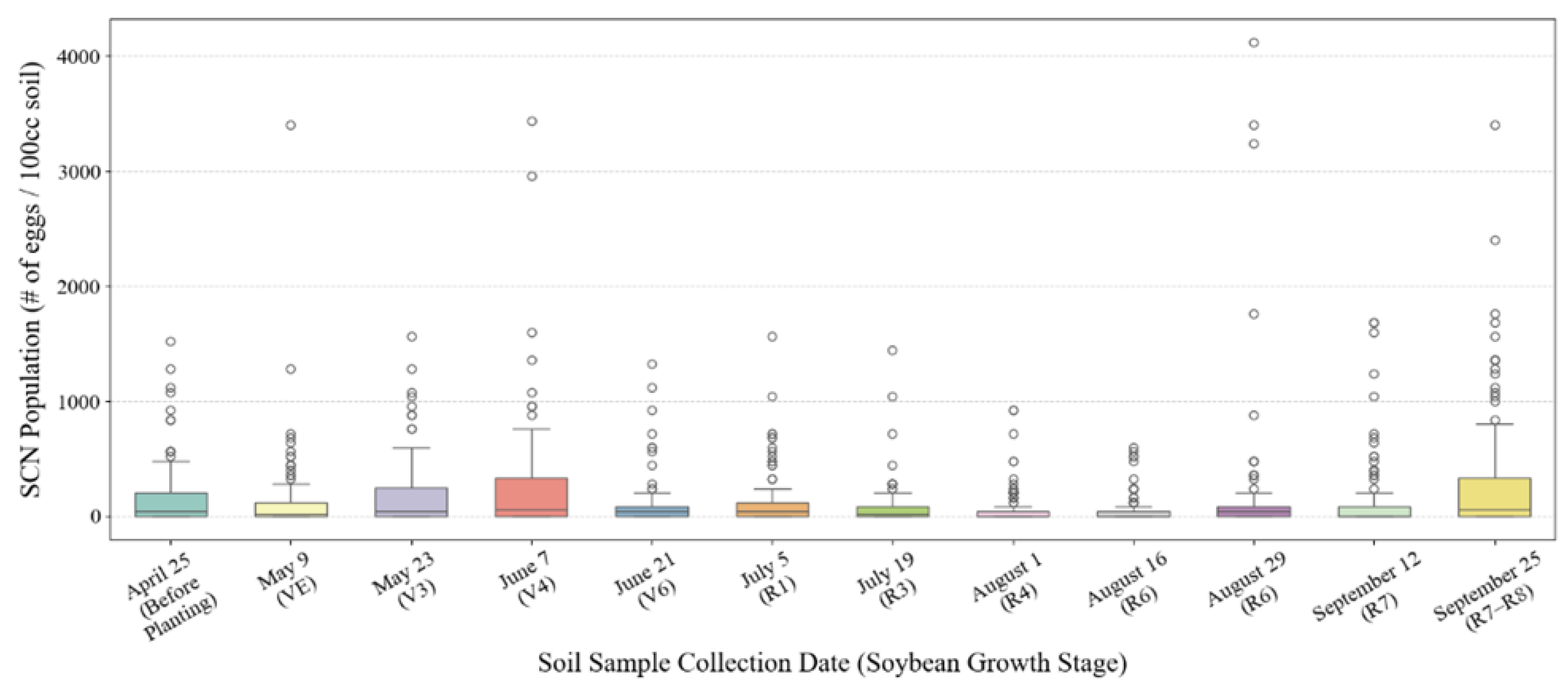 4.2.2. Optimal Time Period and Growth Stage for SCN Detection