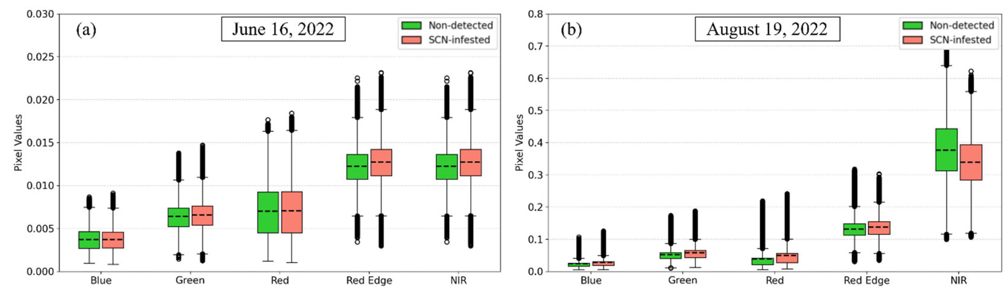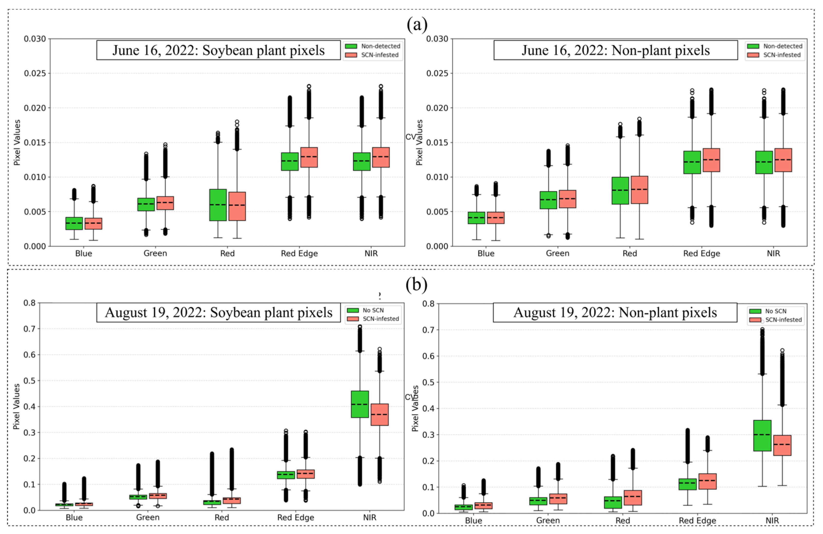 - Near-infrared (NIR) spectral band is a strong discriminator between non-detected and SCN-infested areas.