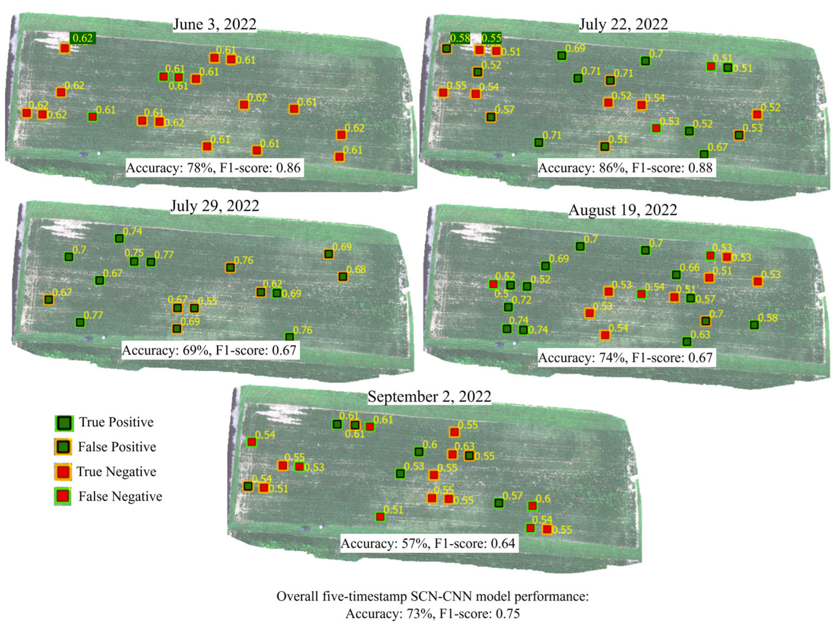 4.1. Contribution of Multispectral Imagery to SCN Detection