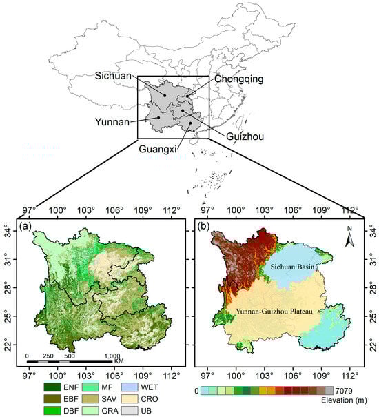 Southwest China is located between 21°08′–34°19′N and 97°21′–112°04′E and consists of five provinces: Sichuan, Chongqing, Guizhou, Yunnan, and Guangxi. The region covers approximately 1.37 million km2, accounting for about 14.3% of China’s total land area. As shown in Figure 1, the study area is characterised by highly complex topography, with elevation increasing from the lowlands of southern Guangxi to the high mountains and deep valleys of the Hengduan Range, resulting in a total relief exceeding 6500 m. The terrain comprises a composite landscape of mountains, plateaus, and basins. Karst landforms are widely distributed, making the region one of the most representative karst concentration zones worldwide. Land cover types are diverse and are dominated by forests, grasslands, and croplands, exhibiting pronounced vertical zonation and spatial heterogeneity. Owing to its extensive forest resources and ecological complexity, Southwest China plays an important strategic role in China’s regional development framework and constitutes a key ecological security barrier.