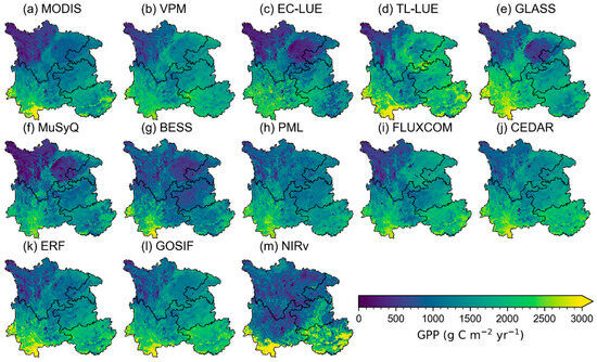 Figure 2 shows the multi-year mean GPP (2001–2015) from 13 products. Despite differences in model principles, the products agree on a large-scale gradient, with lower GPP in the northwest and higher GPP in the south. Low GPP is concentrated in the high-elevation northwestern sector, whereas high GPP occurs mainly in the southern and southeastern areas. Most products show lower GPP in the Sichuan Basin than in surrounding mountains, but higher GPP than on the northwestern plateau. Central areas (southern Sichuan, northern Yunnan, and most of Guizhou) show intermediate GPP, forming a transition zone. Products differ markedly in absolute magnitude, spatial texture, and internal consistency. TL-LUE, GLASS, and ERF show higher GPP and larger high-value areas, whereas EC-LUE, MuSyQ, and BESS yield lower values over most regions (Figure 2). Differences among LUE products are most pronounced in and around the Sichuan Basin. The two proxy products diverge, with NIRv consistently lower than GOSIF. In spatial texture, ML products are internally consistent and relatively smooth, while Process products show similar large-scale patterns but differ locally. LUE products are more heterogeneous and patchier, particularly EC-LUE and GLASS, and NIRv shows distinct spatial patterns compared with the other 12 products.
