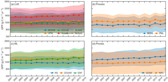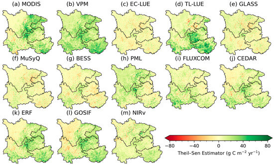 Spatial trends of GPP derived from different products in Southwest China during 2001–2015. LUE products include MODIS, VPM, EC-LUE, TL-LUE, GLASS, and MuSyQ; Process products include BESS and PML; ML products include FLUXCOM, CEDAR, and ERF; and Proxies products include GOSIF and NIRv.