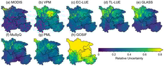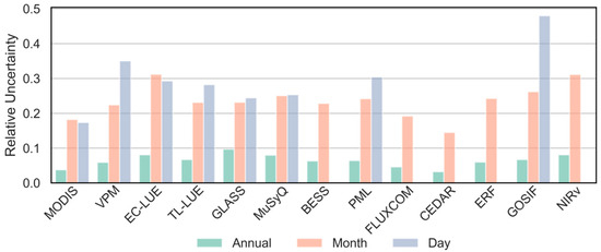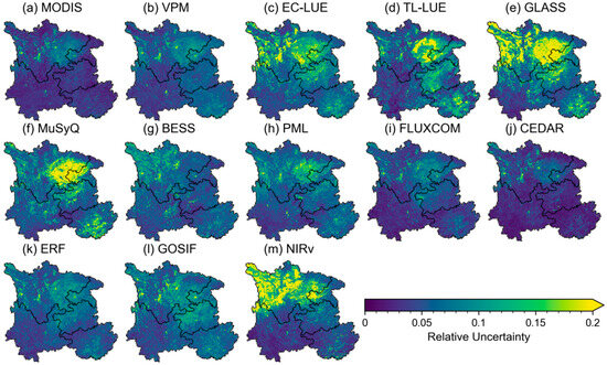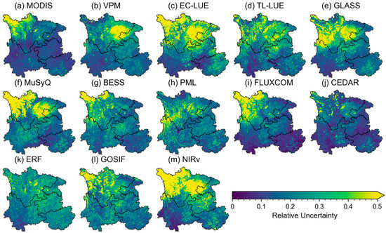 First, we assembled the time series of the 13 GPP products and calculated the reference GPP value. According to Equation (11), the difference matrix was then obtained, and its covariance matrix was computed. Next, Equation (12) was used to derive the diagonal matrix , representing the product-specific GPP error variances. Finally, the relative uncertainty was calculated using Equation (13). RU can be interpreted as the uncertainty level relative to the mean productivity, i.e., a smaller RU indicates lower uncertainty, whereas a larger RU indicates higher uncertainty relative to the mean.
