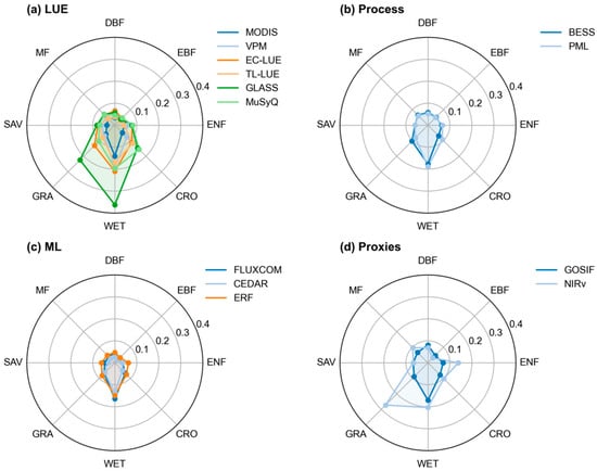 Considering the availability of ground-based data, observations from five flux tower sites in Southwest China were used to compare the performance of the GPP products (Table 3). Overall, products derived from ML models exhibit the highest correlation with flux tower observations, with correlation coefficients (r) ranging from 0.73 to 0.82. Among them, CEDAR shows the strongest correlation (r = 0.82). The two Proxies products display notable differences. GOSIF shows a strong correlation with flux tower data (r = 0.80), with RMSE of 74.70 g C m−2 mon−1 and MAE of 59.85 g C m−2 mon−1. In contrast, NIRv exhibits a weaker correlation (r = 0.56), with a higher RMSE (84.04 g C m−2 mon−1) and MAE (69.06 g C m−2 mon−1). For the process models, PML and BESS show a large difference in correlation coefficients, with r values of 0.49 and 0.75, respectively. However, their RMSE and MAE values are relatively similar (RMSE = 77.04 and 75.05 g C m−2 mon−1 and MAE = 64.49 and 63.40 g C m−2 mon−1, respectively). Substantial variability in correlation with flux tower observations is also observed among products based on the LUE framework. TL-LUE exhibits the highest correlation with flux tower data (r = 0.80), with an RMSE of 78.59 g C m−2 mon−1 and an MAE of 68.54 g C m−2 mon−1. VPM, GLASS, and MODIS all show correlation coefficients of approximately 0.75, while MuSyQ has a moderate correlation (r = 0.67). In contrast, EC-LUE exhibits a much weaker correlation with flux tower observations (r = 0.29), despite RMSE and MAE values (81.80 and 65.78 g C m−2 mon−1, respectively) that are comparable to those of several other products.