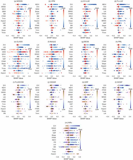 We adopted a “one-product–one-model” strategy: for each of the 13 GPP products, we treated RU as the response variable and trained an independent XGBoost regression model using the same predictor set. To interpret the trained models, we used SHAP, a game-theoretic framework that decomposes each RU prediction into an additive sum of feature contributions [50]. For each product-specific model, SHAP values were computed for all drivers, providing pixel-level estimates of both the magnitude and direction of each driver’s contribution to RU. We interpreted the results primarily through SHAP distribution plots: the horizontal spread reflects the magnitude and variability of a driver’s influence on RU, the signs of SHAP values indicate whether the driver tends to increase or decrease RU, and the colour gradient represents the corresponding driver value. This distribution-based interpretation allowed us to identify the dominant contributors to RU and compare driver sensitivities and contribution directions among GPP products.