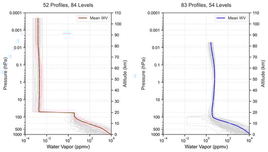 Figure 1 and Figure 2 show the temperature and water vapor distributions constructed by Peter Rayer (Met Office) (52 profiles randomly selected) compared with the conventional profiles. From Figure 1, the temperature profiles with 84 levels (red line) and 54 levels (blue line) have a consistent distribution at the same altitude. Both profiles match the real atmospheric temperature characteristics of the troposphere, stratosphere, and mesosphere within the range of 1000–0.01 hPa (approximately 0–80 km). At pressures above 0.01 hPa, where water vapor and ozone concentrations are relatively low, the mole fraction of oxygen also tends to stabilize. To simplify radiative transfer simulation and analysis, the content of water vapor and ozone, as well as the oxygen mixing ratio, are set to fixed values in this study.