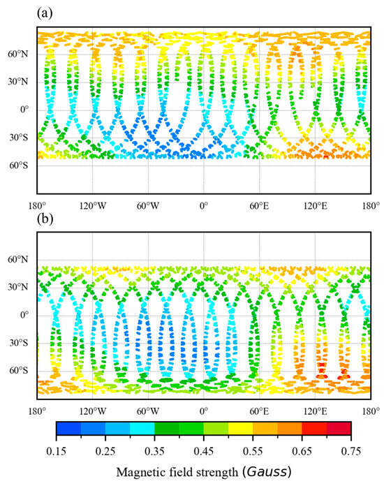The SSMIS onboard the Defense Meteorology Satellite Program’s Flight 17 (DMSP-F17) observations in 2024 are utilized to investigate factors influencing microwave radiative transfer simulations. Specifically, SSMIS channels 19 and 20 are selected, with peak detection heights of 0.2 hPa and 0.08 hPa, respectively. To achieve accurate comparison with observations, input profiles derived from the SABER V2.0 Level 2A and the IGRF-13 dataset are matched with SSMIS observations based on three strict principles: 1. The latitude and longitude absolute difference between two data points is less than 2°, and the distance between the two points is the smallest of all data pairs. 2. The absolute time difference between observations is less than 1 h. 3. SSMIS channel 19 is matched according to a height of 0.2 ± 0.1 hPa, and channel 20 is matched at 0.08 ± 0.1 hPa. The 1st and 2nd of each month from January to December 2024 are selected for this experiment, totaling 24 days of observation. Building on the foundational research of prior studies [14,17], this study systematically investigates and compares the effects of geomagnetic field dimensions and Zeeman splitting coefficients on the RS-LBL model simulation.