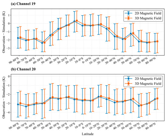 Distribution of DMSP-F17 SSMIS (a) channel 19 and (b) channel 20 observation and simulation biases (O-B) with global latitude (statistics by every 10°). Blue represents simulation results using the two-dimensional (2D) Earth’s magnetic field as input, while orange indicates simulation results using the three-dimensional (3D) Earth’s magnetic field.