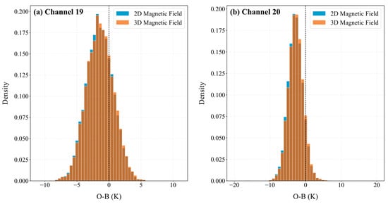 The O-B probability density functions (PDF) of DMSP-F17 SSMIS (a) channel 19 and (b) 20. The blue and orange represent the PDF derived from the 2D and 3D geomagnetic field parameters, respectively.