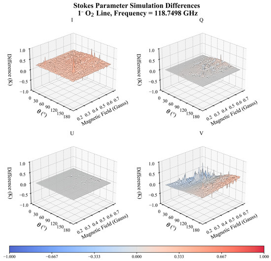Figure 8 and Figure 9 illustrate the RS-LBL model simulation differences of the Stokes parameters I, Q, U, and V under fixed frequencies and varying magnetic fields. Typically, I represents the total radiance intensity, Q denotes the difference between vertical and horizontal linear polarization, U indicates the difference between ±45° linear polarization, and V signifies the difference between left- and right-hand circular polarization [39]. As seen in Figure 8, the simulated difference of total intensity I exhibits significant fluctuations with respect to Be and θ. This is because I represents the superposition of all magnetic energy level transition signals, reflecting the global characteristic of the Zeeman splitting effect. In contrast, the circular polarization component V exhibits alternative positive and negative variations with θ at a fixed magnetic field strength. Its amplitude is comparable to that of I, but approaches zero near θ = 90°. This phenomenon indicates that the simulation differences between left- and right-hand circular polarizations follow an antisymmetric distribution with θ. When the magnetic field vector is perpendicular to the electromagnetic wave propagation direction, these simulation differences cancel each other out. Overall, the simulated differences of I, Q, and V are greater than that of U. This may be due to the azimuthal symmetry of the angle between the magnetic field vector and the electromagnetic wave propagation direction, leading to significant signal suppression of the U component. For the 1− line (Figure 9), the simulated difference of the I component is relatively weak, generally around 0.15 K. Beyond the influence of frequency selection, this subtle difference is also related to the unique energy level transition structure of the 1− line. According to reference [17], the Zeeman ‘g-factor’ for the low-energy level of the 1− line does not couple with the magnetic field. Therefore, the simulation difference is only attributable to higher-order Zeeman effect corrections at higher energy levels. Similar to the 7+ line, the U component of the 1− line still exhibits minimal simulation differences. Meanwhile, the difference of the V component, which represents the circular polarization, alternates between positive and negative with θ at a fixed magnetic field strength.