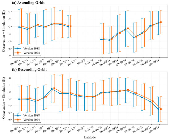 Although the Zeeman splitting correction has a negligible effect on the simulation of the 1− line (the energy level transition with angular momentum 0), it still significantly impacts the 7+ line with intermediate . The authors of reference [17] have theoretically demonstrated the superiority of this improvement. However, whether the updated Zeeman splitting coefficient can improve the simulation accuracy of the RS-LBL model still requires validation through real observations. The detection frequency of SSMIS channel 20 is based on the 7+ and 9+ O2 absorption lines [40], enabling the assessment of Zeeman splitting coefficient corrections on real observations and applications. Therefore, the atmospheric and geomagnetic field parameters derived from SABER V2.0 and IGRF-13, respectively, are used as input profiles for the V_1988 and V_2024 of the RS-LBL model. Observations from the 1st to the 2nd of each month in 2024 (totaling 24 days) of DMSP-F17 SSMIS channel 20 are used to validate the RS-LBL model simulation differences. The O-B is statistically averaged for each 10° latitude band, as shown in Figure 10.
