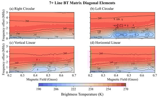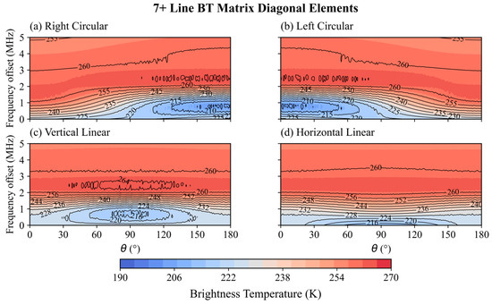 7+ line center frequency shift from 0 to 5 MHz (step of 1 MHz) simulated brightness temperature distribution with θ from 0 to 180° (step of 1°) for (a) right-hand circular polarization; (b) left-hand circular polarization; (c) vertical linear polarization; and (d) horizontal linear polarization.