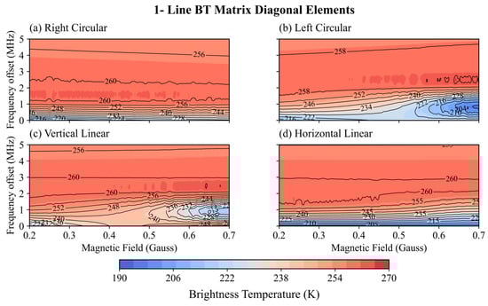 Figure 13 displays the simulations for the 1− line. The horizontal axis represents magnetic field strength from 0.2 Gauss to 0.7 Gauss in steps of 0.01 Gauss, while the vertical axis shows the frequency offset from the O2 line center (0–5 MHz increase with 1 MHz). As shown in Figure 13, the isotherms for all four polarizations are nearly horizontal when the frequency shift exceeds 3 MHz, indicating that the effect of Be on simulations is significantly weakened. However, the simulated BTs are extremely sensitive to Be near the line center, especially for left-hand circular and vertical linear polarization. Specifically, extensive low temperatures appear when the Be is larger than 0.5 Gauss. It is noteworthy that the low-temperature area of vertical linear polarization (220–240 K in Figure 13c) is approximately 20 K higher than that of the left-hand circular polarization (204–222 K in Figure 13b). Meanwhile, simulated brightness temperature decreases as the magnetic field strength increases. These phenomena directly reflect how the detection altitude of the 1− line varies with magnetic field strength. Right-hand circular (Figure 13a) and horizontal linear (Figure 13d) polarization have lower dependence on Be but are highly sensitive to frequency offset.