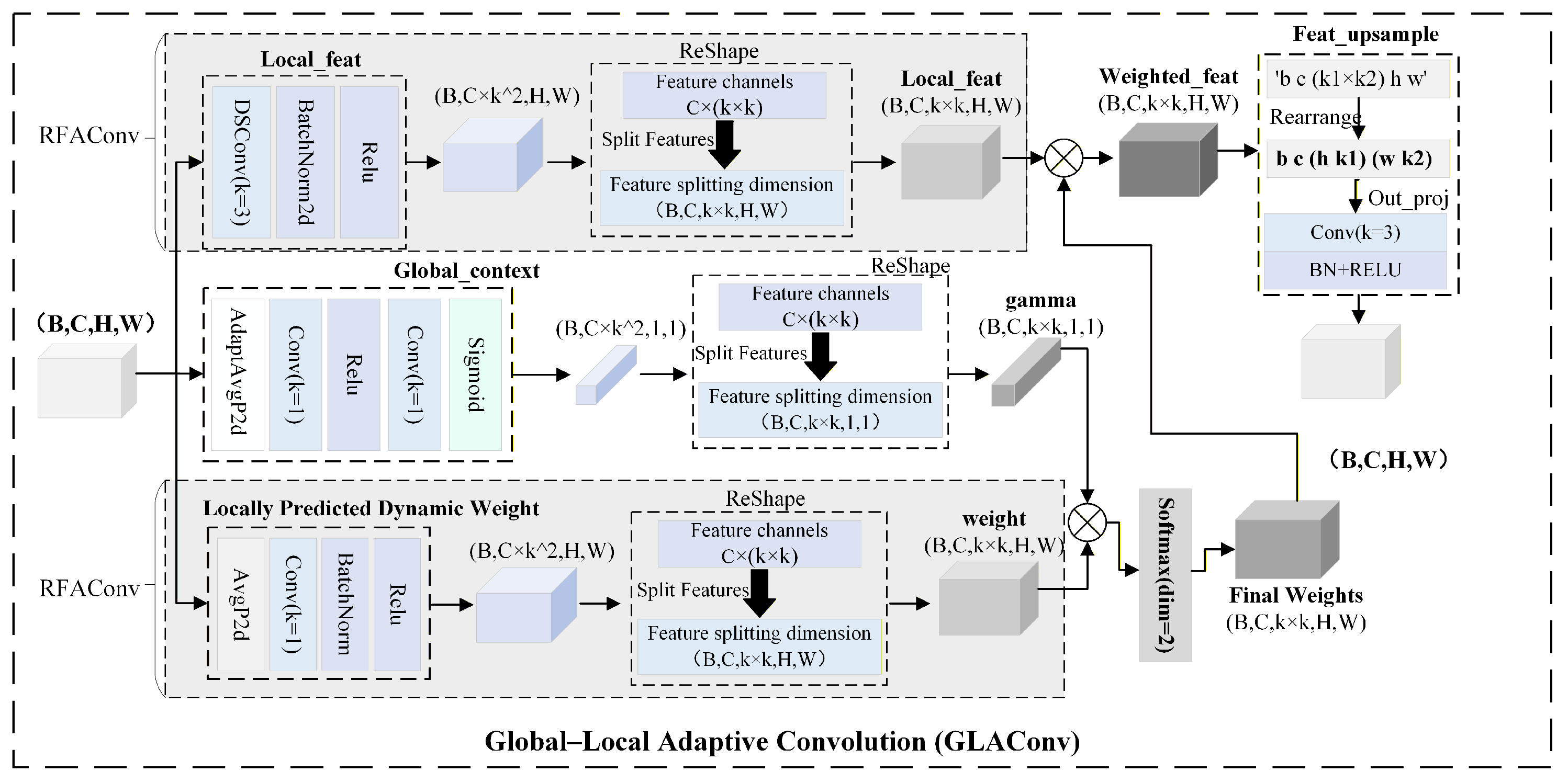 We design the Global–Local Adaptive Convolution (GLAConv) module, which dynamically models the dependency between global context and local responses to generate content-aware convolutional weights. This enables truly spatially and semantically adaptive feature extraction, significantly enhancing the representational capacity for heterogeneous regions such as urban–rural fringes and mixed-use areas.