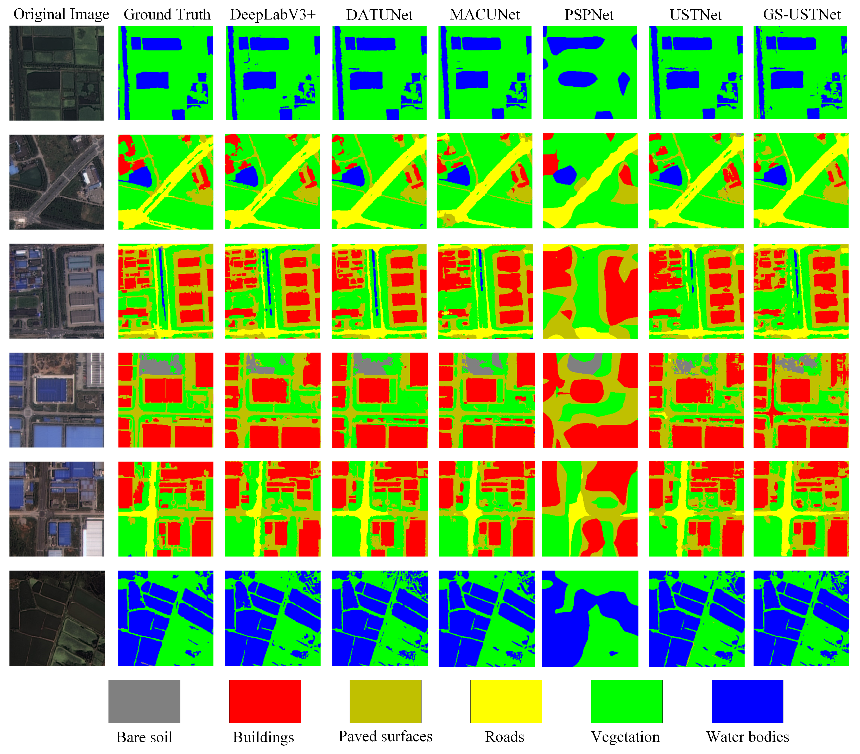 From the overall segmentation results, GS-USTNet demonstrates a strong ability to distinguish between different land cover types in complex scenes with multiple coexisting classes. Its predictions exhibit high spatial consistency with the ground truth annotations. Notably, in regions where buildings are closely adjacent to other land covers, the model accurately delineates red building areas and effectively suppresses leakage into neighboring vegetation (green) or paved areas (olive yellow), thereby significantly reducing inter-class confusion.For linear or boundary-sharp objects with large-scale variations—such as roads and water bodies—GS-USTNet also shows superior structural integrity. The visual results reveal that road regions (yellow) maintain good connectivity with notably fewer fragmentation artifacts. Water bodies (blue) exhibit complete contours and sharp boundaries against surrounding vegetation or bare soil, indicating robust fine-grained structure modeling and boundary discrimination capabilities. Moreover, for spectrally similar classes such as paved areas and bare soil, several baseline methods suffer from noticeable misclassifications, whereas GS-USTNet stably distinguishes gray bare soil from olive yellow paved regions, leading to improved regional completeness and semantic coherence. This observation suggests that the integration of the Global–Local Adaptive Convolution (GLAConv) module enhances the model’s discriminative power by effectively fusing contextual information with local textural cues.