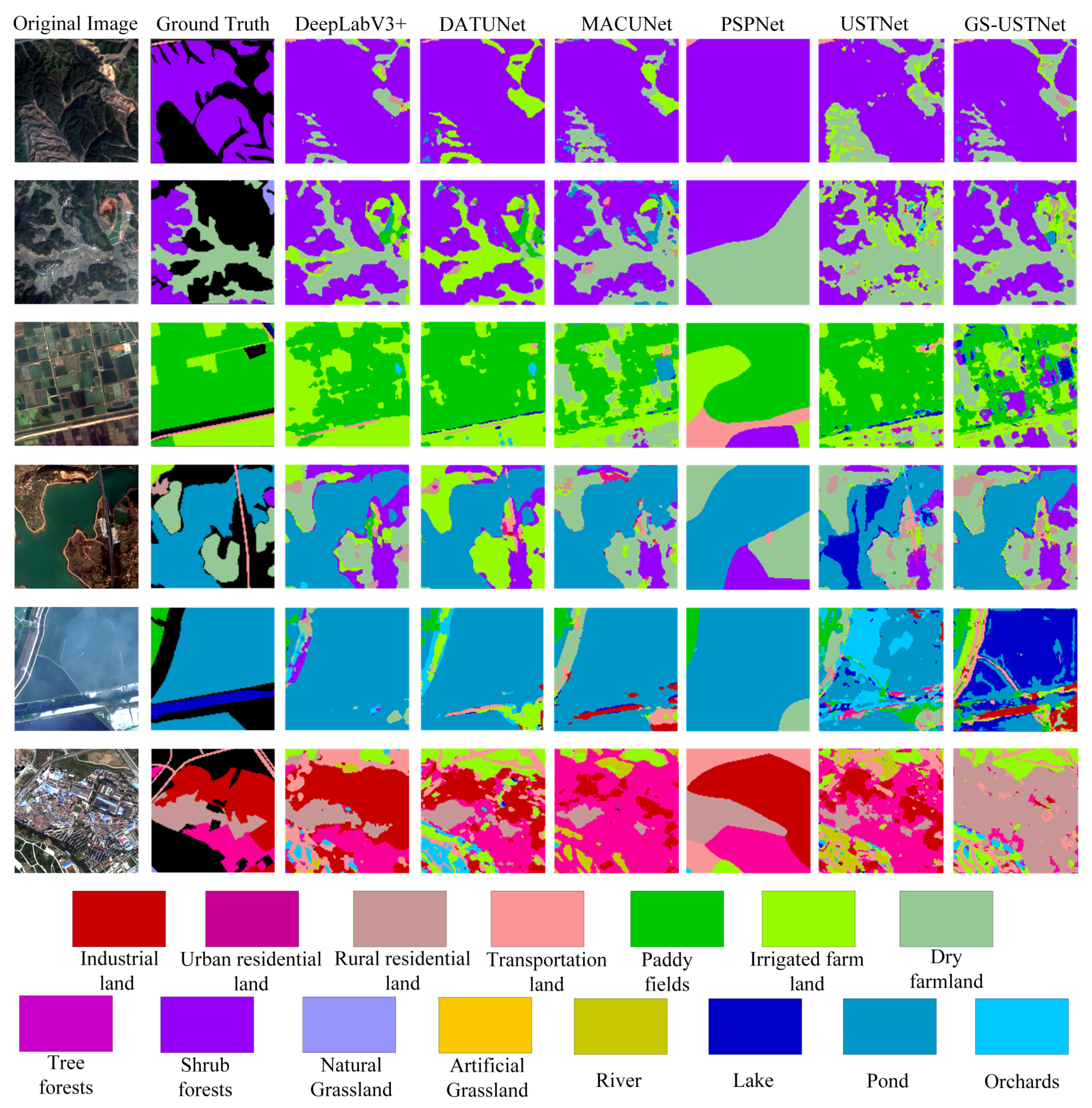 Qualitative analysis reinforces these findings. Across diverse scenes—ranging from dense urban areas to intricate agricultural–forestry–water systems—GS-USTNet produces segmentation maps with high semantic coherence, sharp boundaries, and minimal misclassification. The visual fidelity aligns closely with ground truth annotations and supports the quantitative trends, thereby enhancing the credibility of our conclusions.