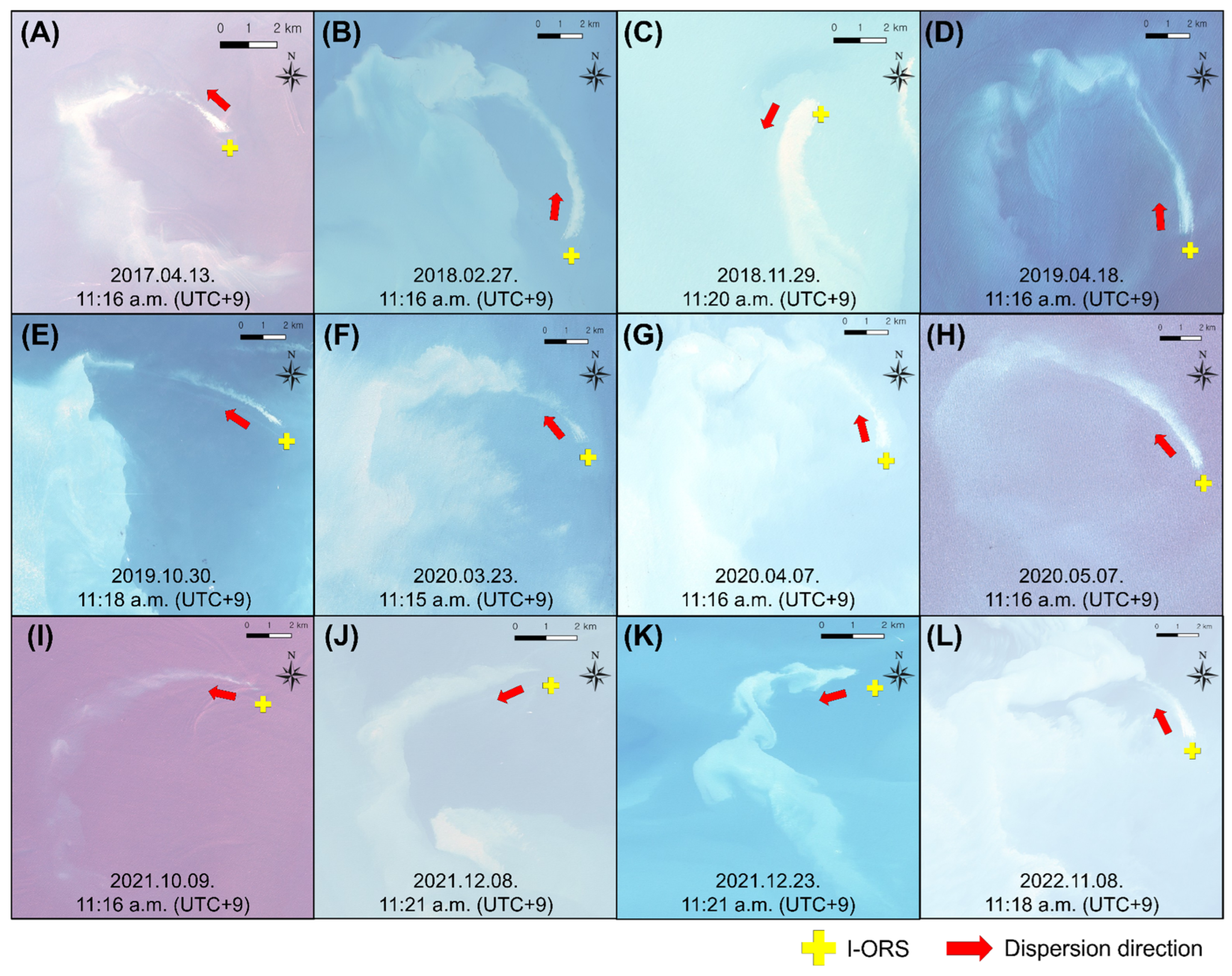 APA StyleHwang, S., Kim, S.-Y., Lee, J.-S., Lee, S.-C., Jeong, J.-Y., Lu, W., & Jo, Y.-H. (2026). Observation of Sediment Plume Dispersion Around Ieodo Ocean Research Station in the Middle of the Northern East China Sea Using Satellites and UAVs. Remote Sensing, 18(5), 795. https://doi.org/10.3390/rs18050795