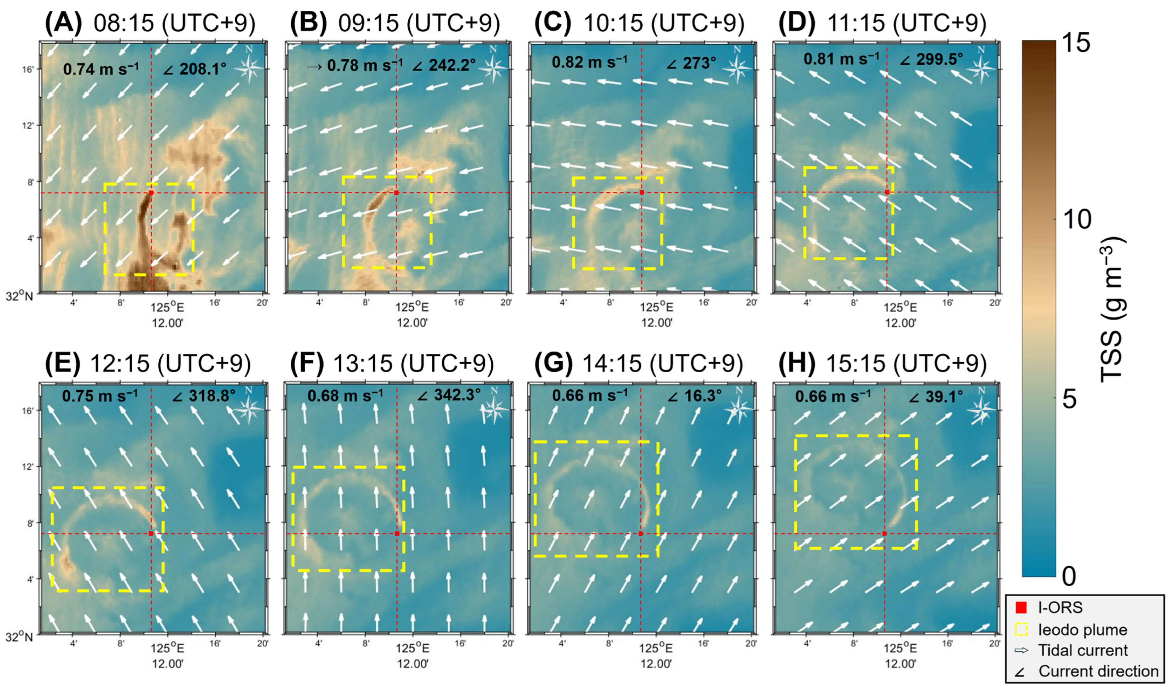 - Satellite observations indicated that the Ieodo plume repeatedly originates from a point on the summit of the Ieodo Seamount, located near the I-ORS. Exhibiting an initial width of approximately 0.5 km, it develops into a band-shaped structure that curves counterclockwise and disperses over a spatial extent of 11.4 ± 3.2 km in the east–west direction and 14.3 ± 4.1 km in the north–south direction. The initial development of the Ieodo plume was controlled by tidal currents, with the highest TSS occurring when the southward current component was strongest during the day. Following its formation, the band or ring structure of the plume underwent a counterclockwise curvature during its clockwise rotation along the tidal ellipse, and the TSS of the plume decreased with time.
