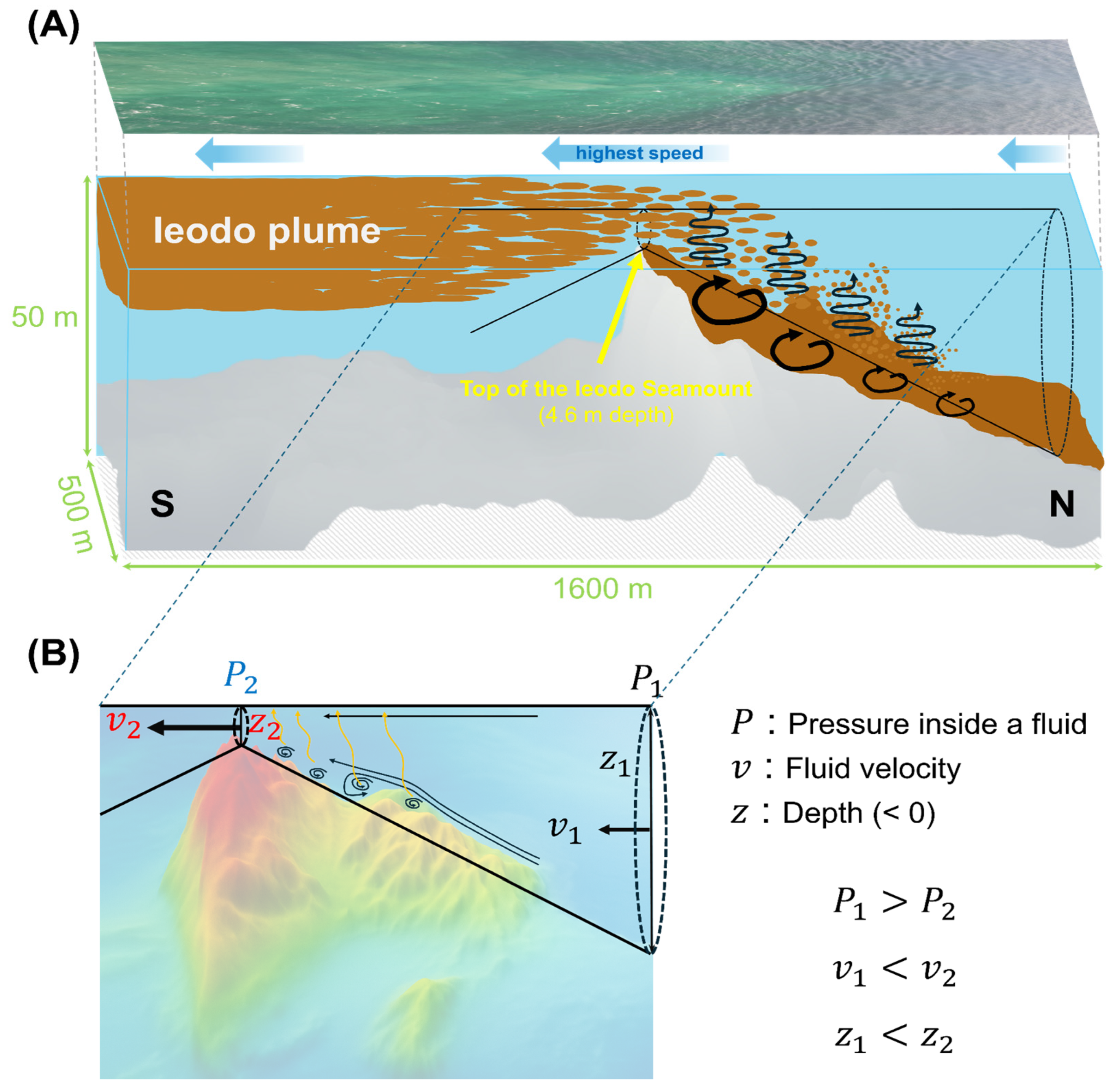- Velocity estimation via LSPIV analysis of georeferenced sequential UAV imagery indicated that the plume speed was highest near the origin and gradually decreased as it dispersed horizontally. In accordance with the interactions between tidal forcing and the topography of the Ieodo Seamount, this behavior can be explained by the Bernoulli principle, which states that flow accelerates as the flow passage narrows. Similarly, the mechanism by which sediments composing the Ieodo plume are lofted toward the sea surface can be interpreted as arising from a reduction in internal fluid pressure, which is required to compensate for increases in flow speed under the conservation of total energy.