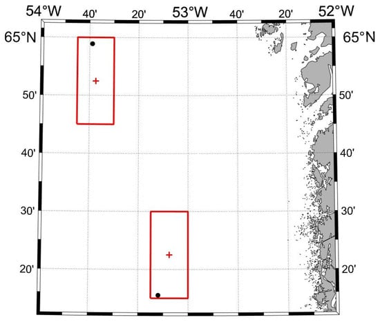 Graphical representation of the co-location method. The map shows the western coast of Greenland, where the red cross marks the satellite grid cell centre, the red box represents the satellite pixel area, and the black dots indicate the positions of two consecutive in situ measurements.
