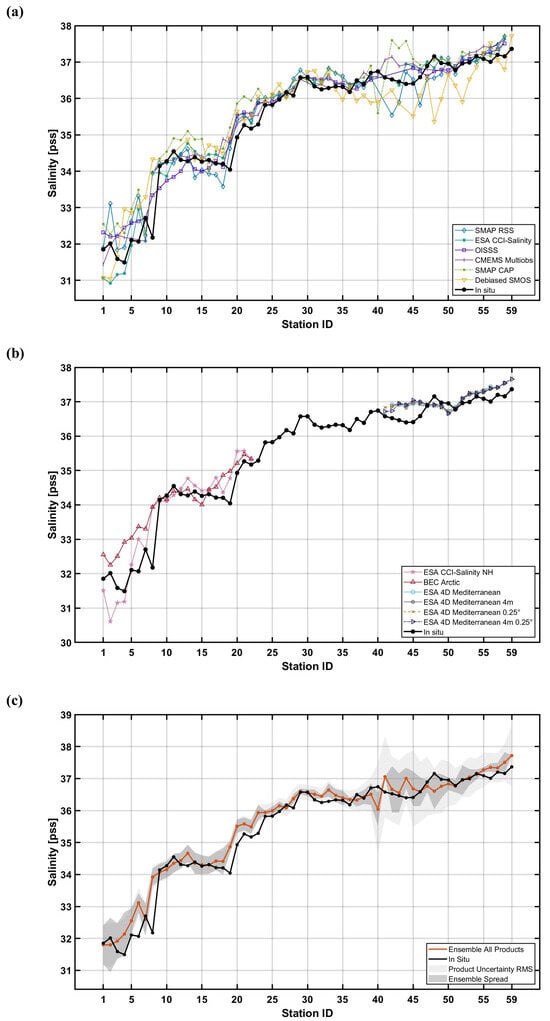 SSS estimated from (a) global and (b) regional satellite products, shown as coloured lines and co-located with the corresponding in situ measurements, plotted as a function of station ID. (c) SSS from the ensemble-mean product together with in situ measurements, shown as colored dots connected by lines as a function of station ID. The shaded areas respectively represent the Root Mean Square (RMS) of the product’s uncertainties and the standard deviation of the product’s salinity values for each matchup.
