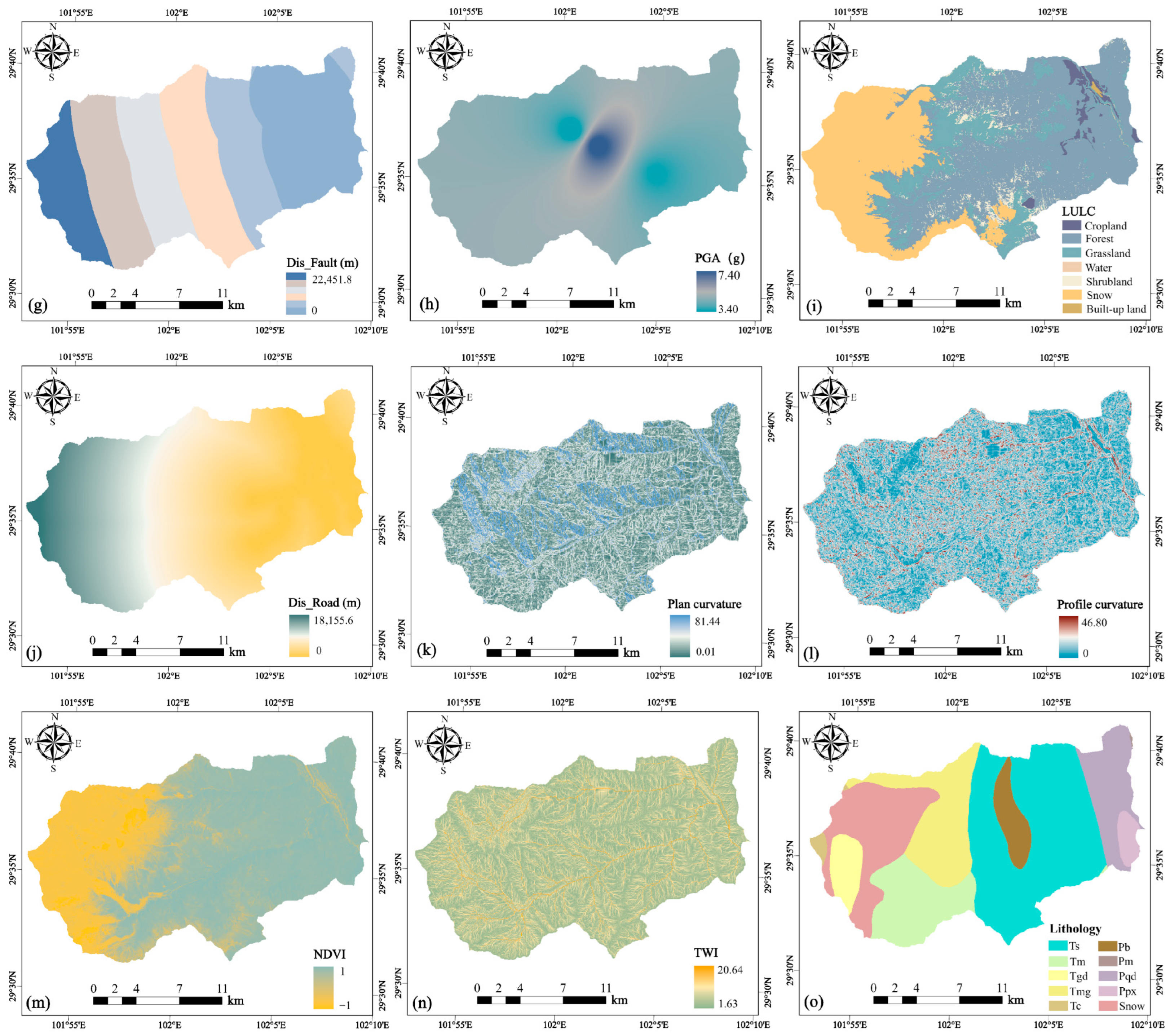 | Altitude, slope, aspect, plane curve, profile curve, TWI, TRI | Raster | ALOS-PALSAR-DEM (https://search.asf.alaska.edu/, accessed on 1 December 2025) | 12.5 m |