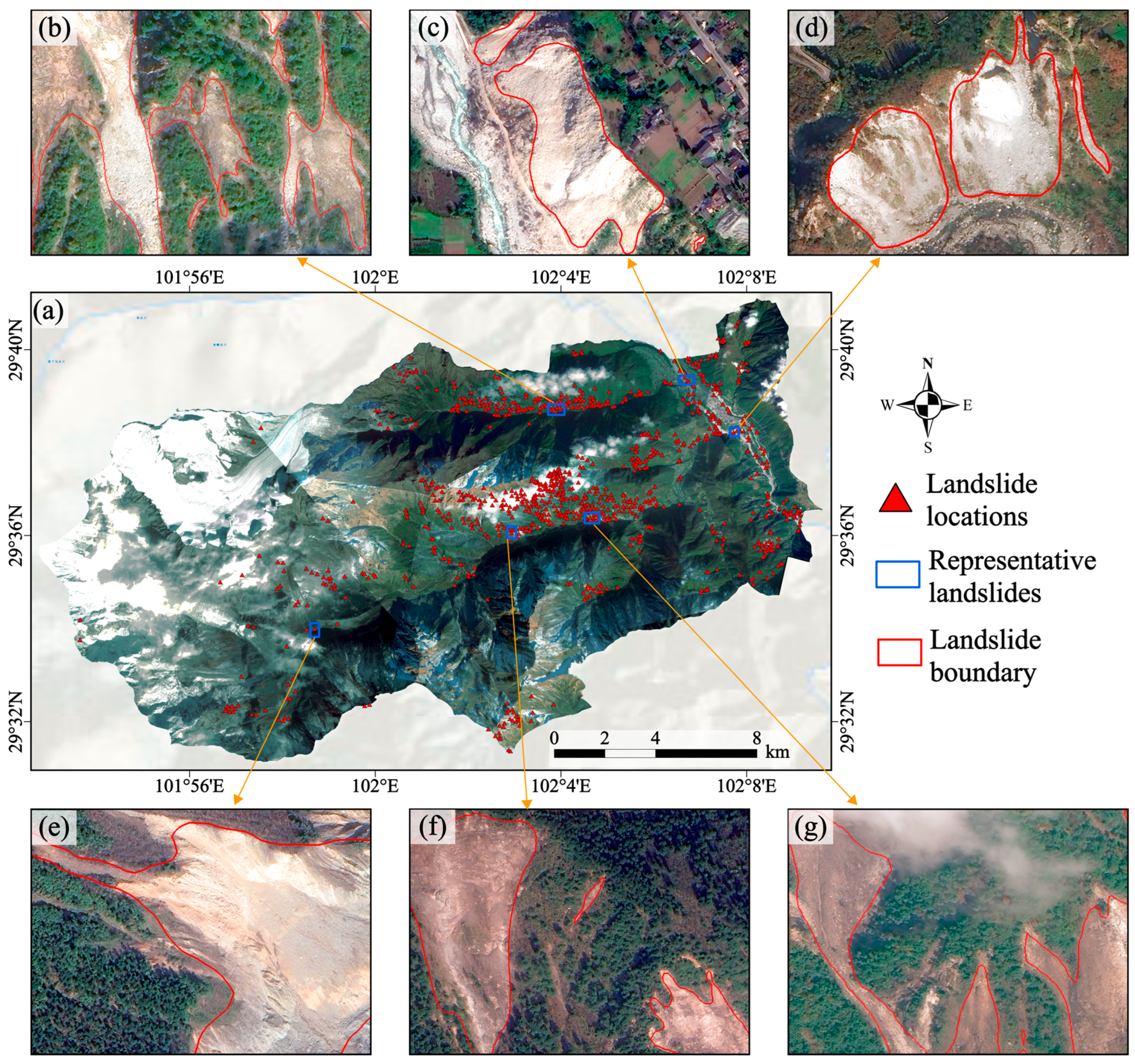 - Xu, Y.; Ouyang, C.; Xu, Q.; Wang, D.; Zhao, B.; Luo, Y. CAS Landslide Dataset: A Large-Scale and Multisensor Dataset for Deep Learning-Based Landslide Detection. Sci. Data 2024, 11, 12. [Google Scholar] [CrossRef]
