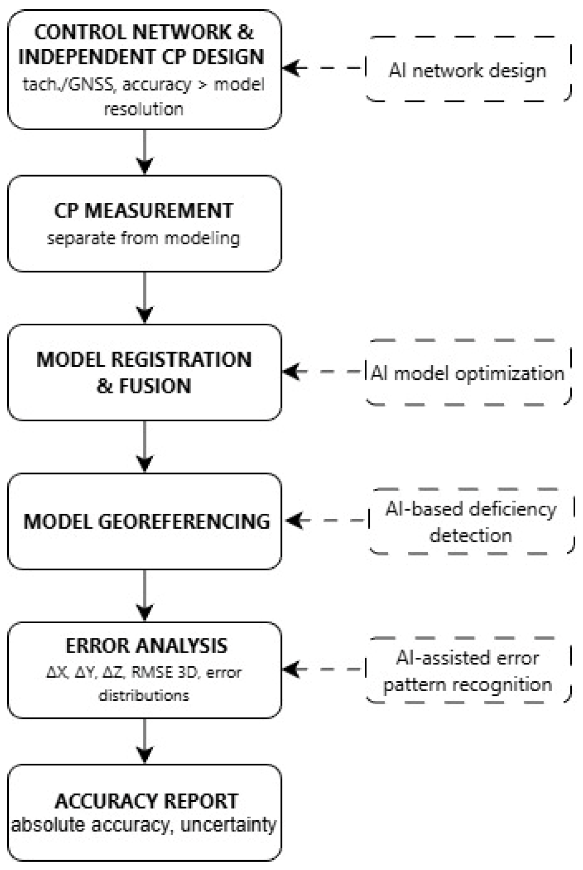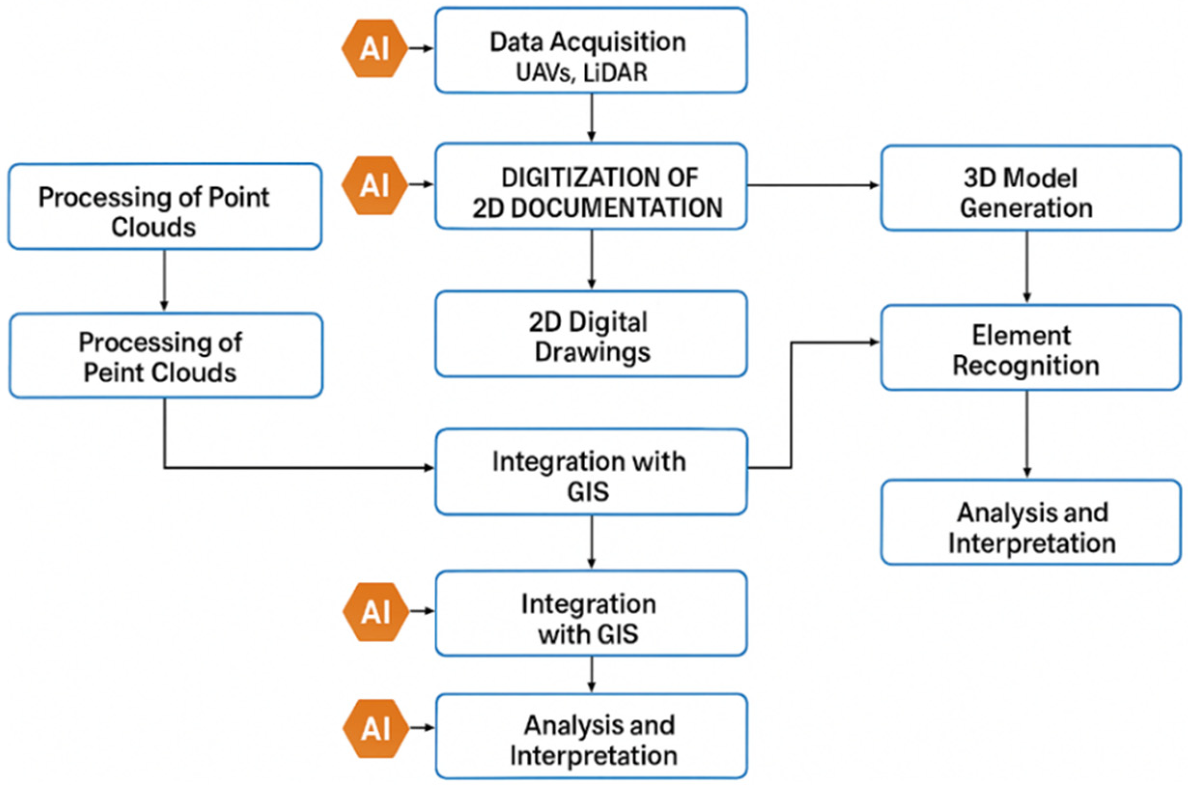 20]. In the present study, such AI procedures were not implemented; they are discussed as prospective, optional extensions intended to augment a standardized TLS-UAV workflow and to enhance semantic enrichment and integration with GIS/HGIS contexts.