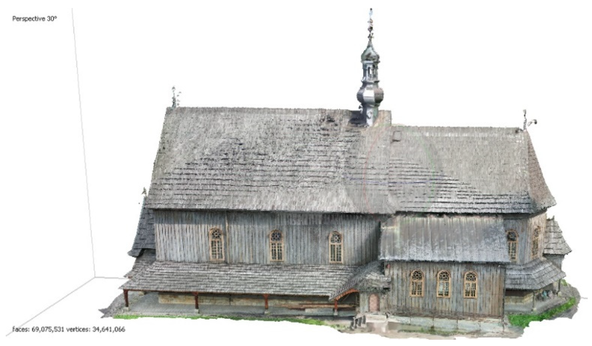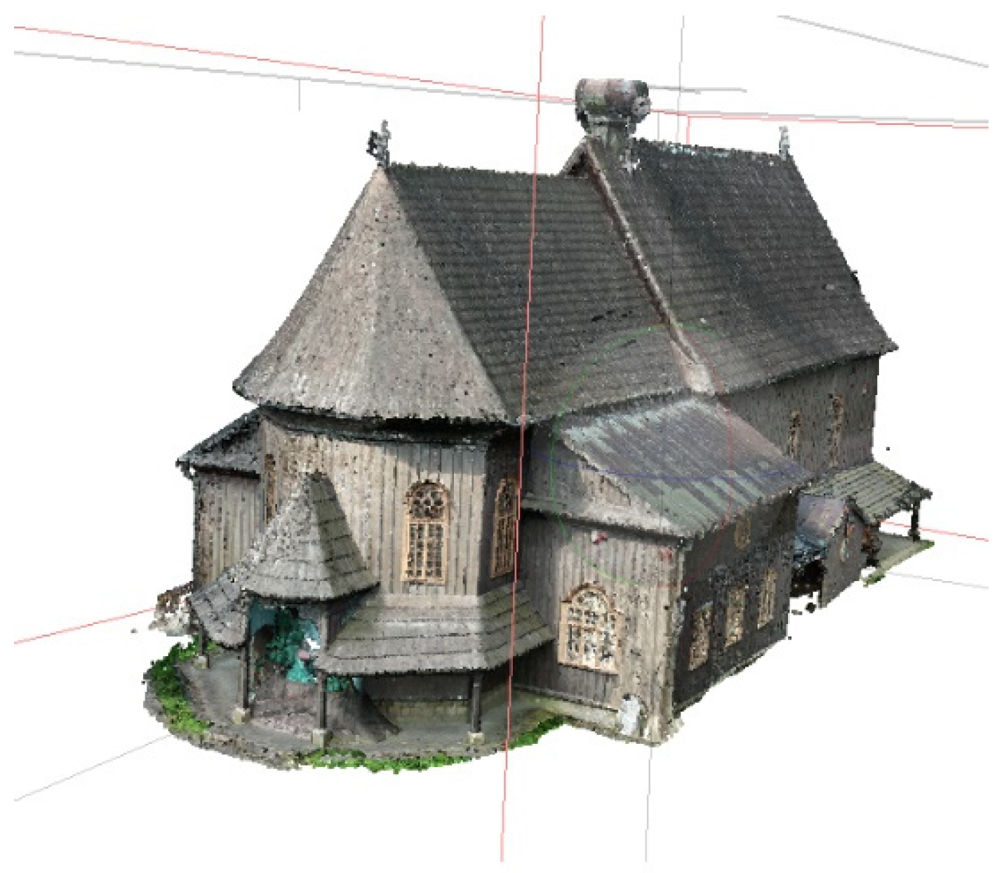 The project began with the design and execution of a field survey that included both terrestrial laser scanning and UAV photography. The collected data were processed using Leica Cyclone, Agisoft Metashape PRO, Microstation V8i, and CloudCompare software. The final result was a mesh-based 3D model of the church, built from an integrated point cloud. Final analyses demonstrated that using integrated data from multiple sources—such as laser scanning and UAV imagery—enables the generation of higher-quality and more complete 3D models [
