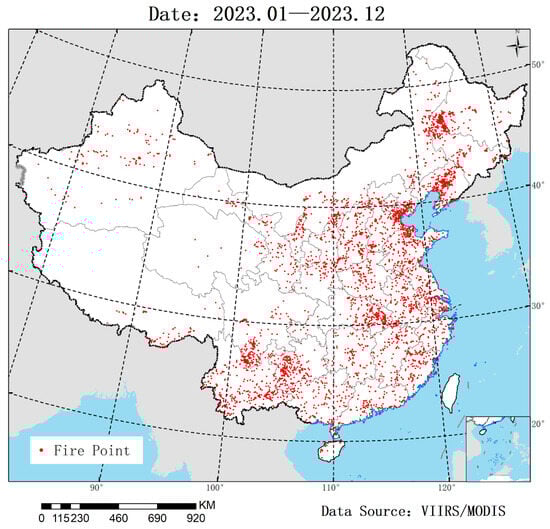 Thermal anomaly data were sourced from NASA’s Fire Information for Resource Management System (FIRMS, National Aeronautics and Space Administration, Washington, DC, USA), covering mainland China for 2023. FIRMS integrates fire point products from VIIRS (375 m resolution) and MODIS (1 km resolution), providing latitude, longitude, detection timestamp, and confidence level [10,11]. (Terminology Note: Throughout this manuscript and its associated figures, the terms “fire points” or “raw fire points” are used interchangeably to denote these initial, unclassified thermal anomalies prior to source attribution. These raw anomalies encompass various high-temperature sources, including actual agricultural fires, industrial emissions, and solar reflections. Distinguishing true straw burning from this heterogeneous mixture is the core objective of our proposed framework.)